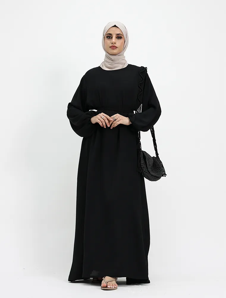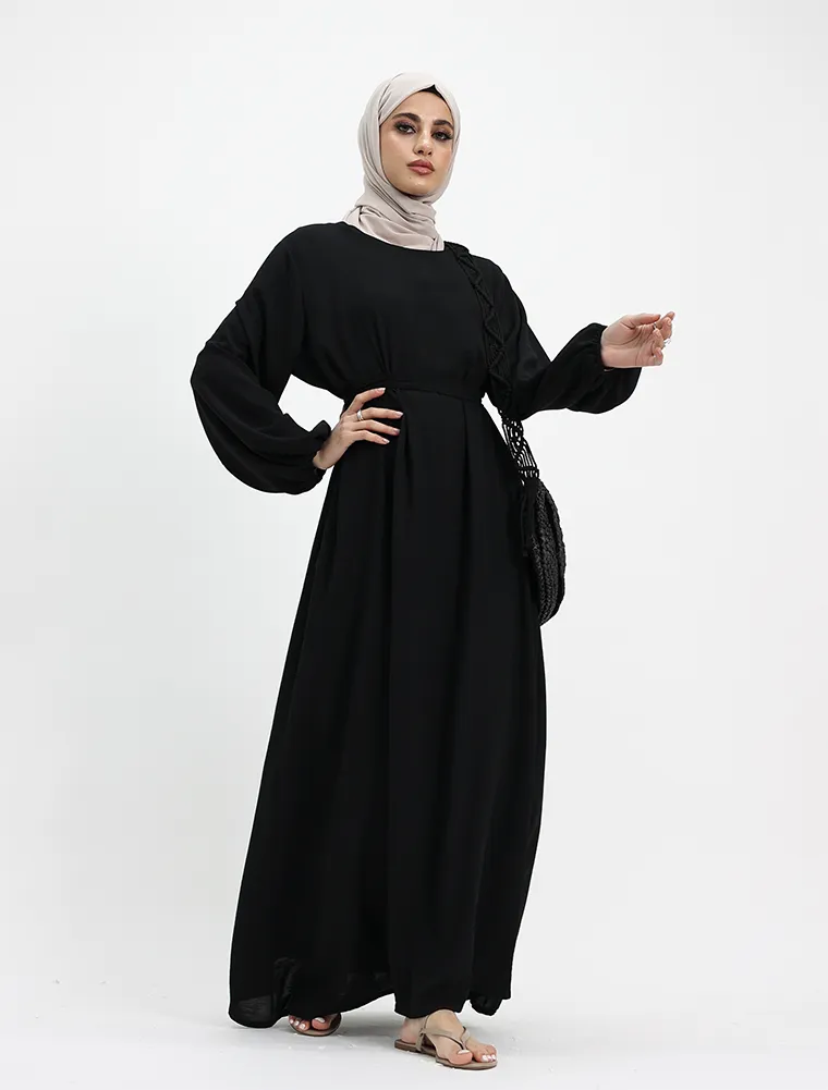 Another basic abaya which you can't go wrong with, although simple it will meet your expectations for your everyday comfort. This dress features an A-line cut flared bottom with pockets on both sides for your essentials, elasticated cuffs to give a slight puff look. A separate belt is included to give a more structured look or you can just opt for the more casual look without it.