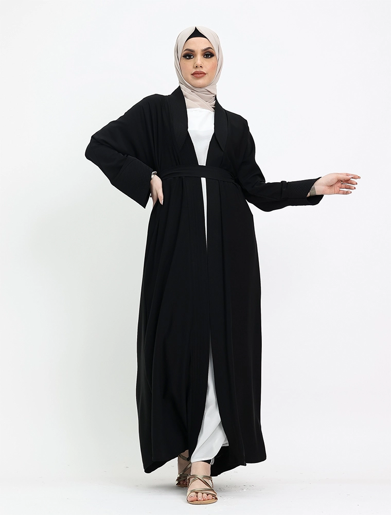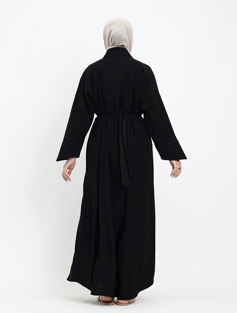 Embrace the elegance of this minimalist open abaya crafted from soft peach-toned fabric. Featuring a padded front placket and cuffs with intricate stitching, it's ideal for both formal occasions and casual outings or holidays. Add the belt for a more defined, structured silhouette.