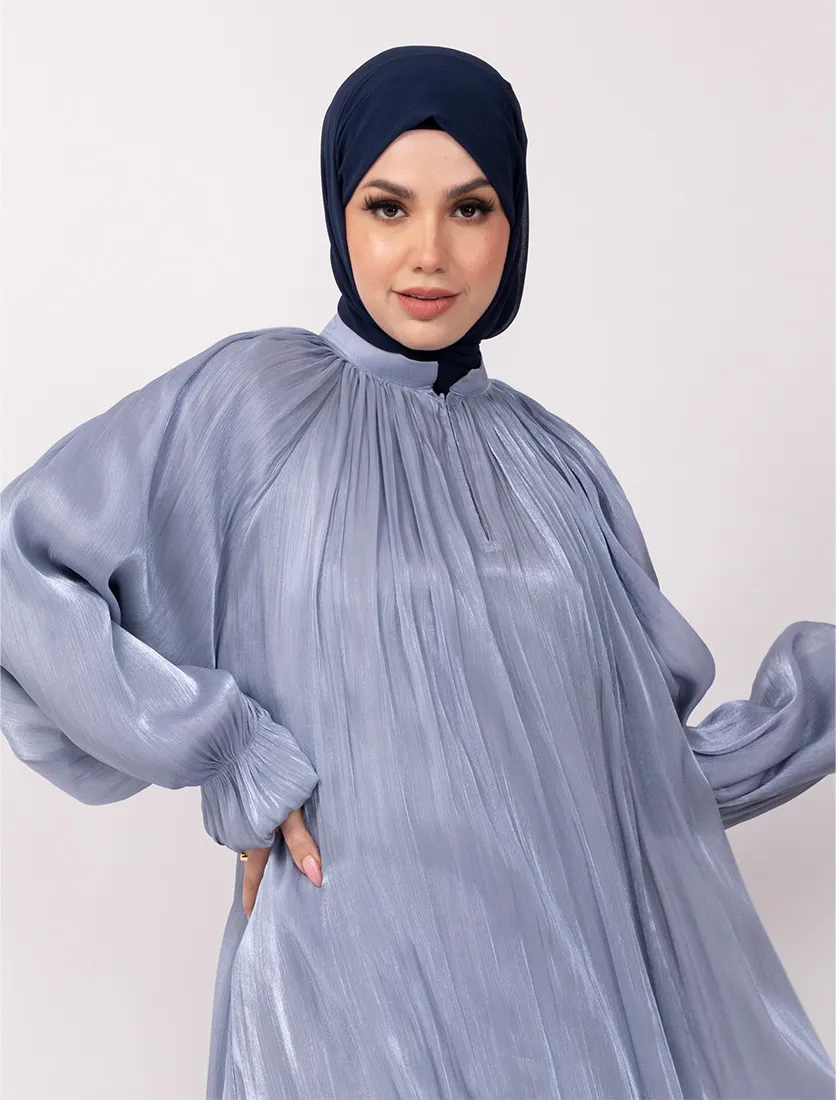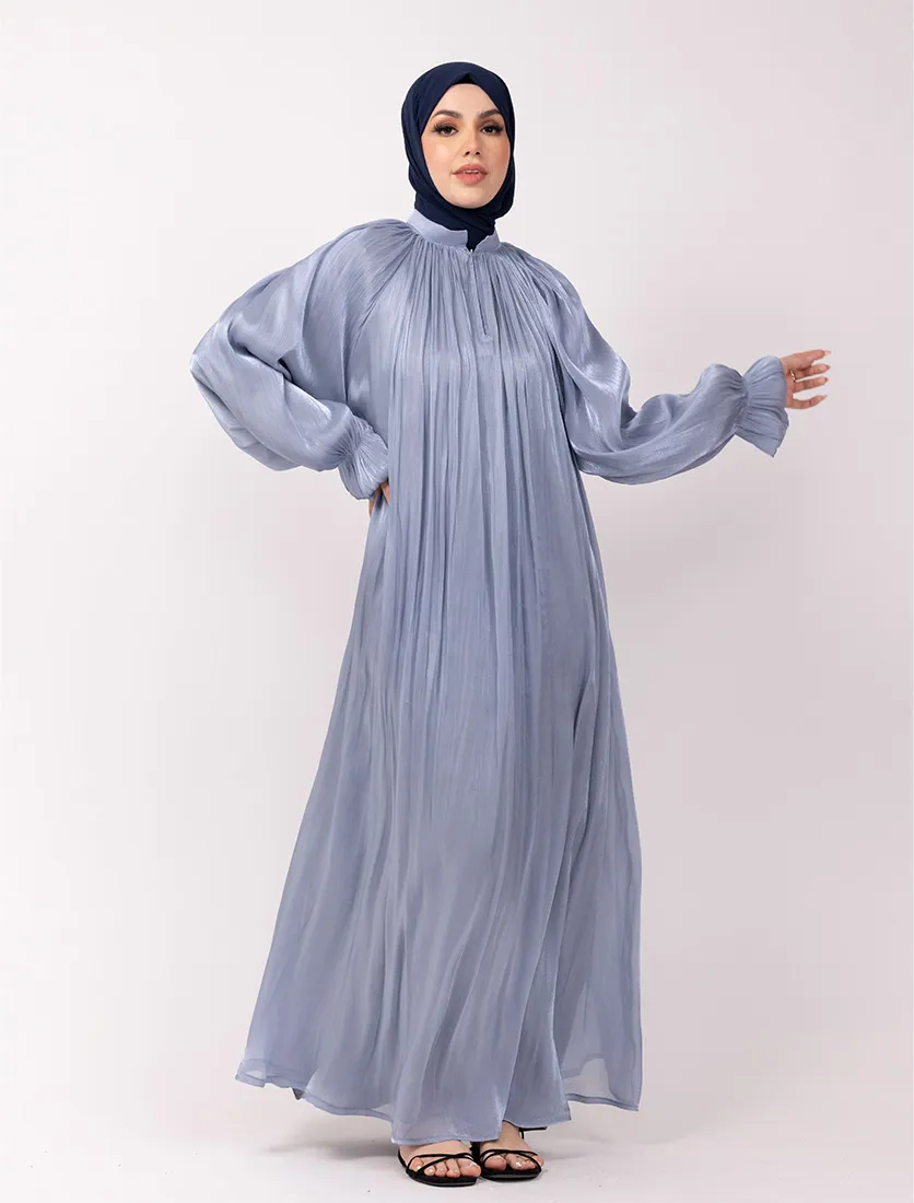 An organza umbrella cut abaya with a separate lining garment typically features an elegant and flowing silhouette due to the umbrella cut. Features a collar, adding a structured element to the abaya. Has a zip opening at the top, making it easy to wear and remove. Balloon sleeves with elasticated cuffs, giving a puffy and stylish look.