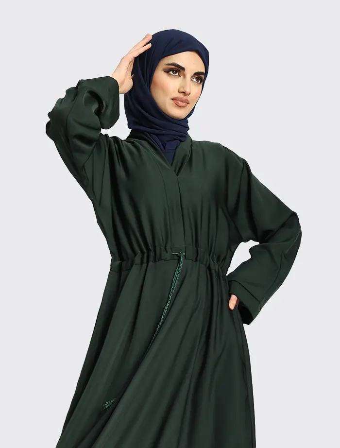 The style features a V-neckline and a draw cord on the waistline to achieve a more structured fit. The Nida fabric compliments the full flare cut umbrella bottom.