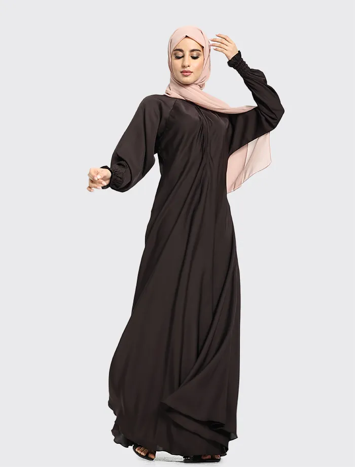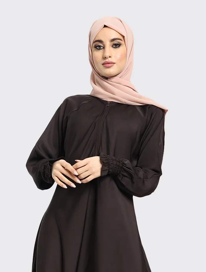 Crafted from premium Nida fabric, this abaya features a full-flare umbrella cut that offers both elegance and comfort. The round neckline is complemented by a concealed front zip for ease of wear, while the sleeves are finished with elasticated cuffs for a modest yet practical touch. Perfect for maternity and everyday wear, this abaya combines effortless style with everyday functionality.