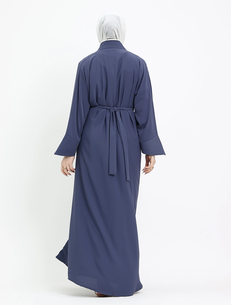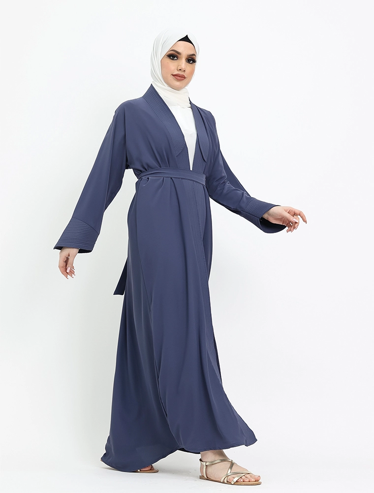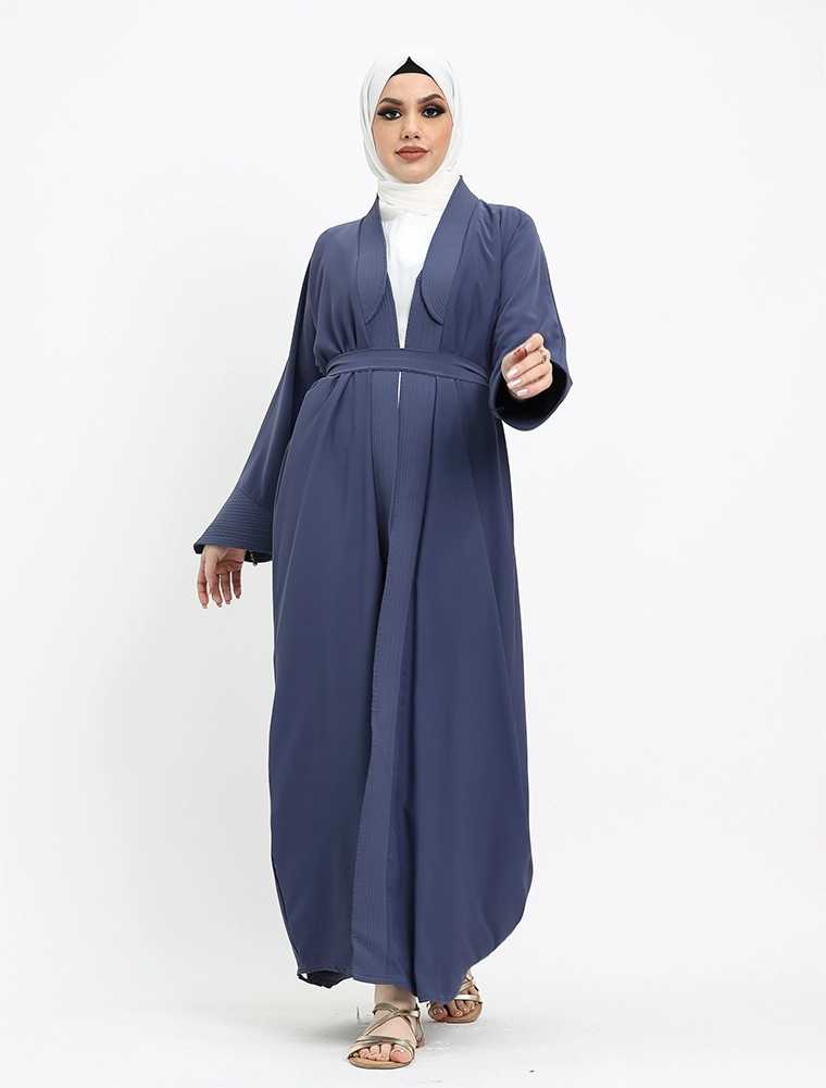 Embrace the elegance of this minimalist open abaya crafted from soft peach-toned fabric. Featuring a padded front placket and cuffs with intricate stitching, it's ideal for both formal occasions and casual outings or holidays. Add the belt for a more defined, structured silhouette.