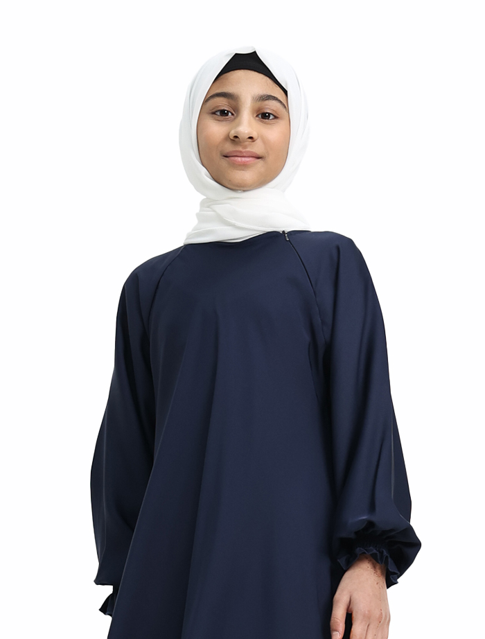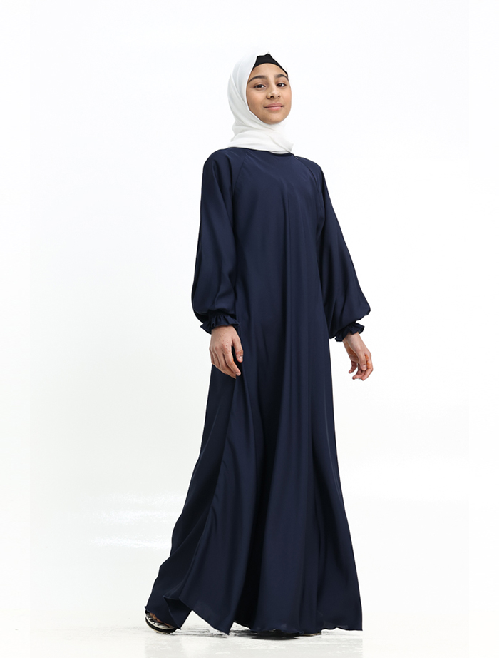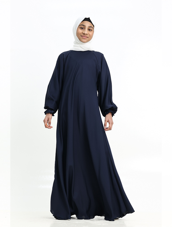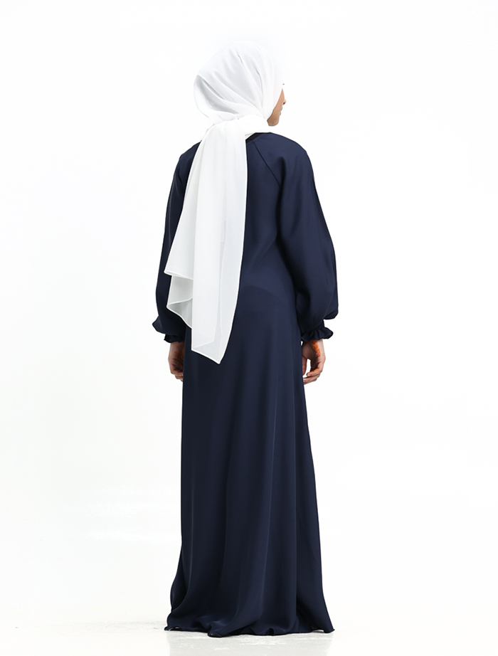 Crafted from soft Nida fabric, this abaya features a full-flare umbrella-style bottom for an elegant silhouette. It comes with a round neckline and a concealed shoulder zip for easy wear. The sleeves are finished with elasticated cuffs, adding a touch of comfort and style. Ideal for everyday wear, this piece combines practicality with timeless design.