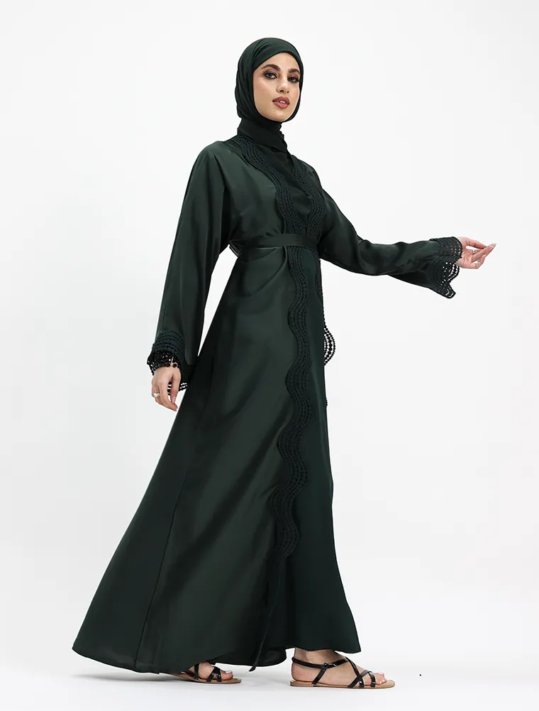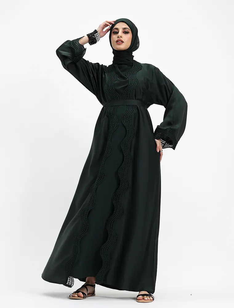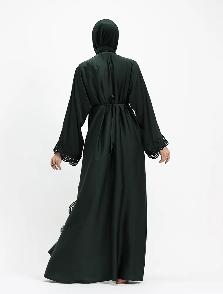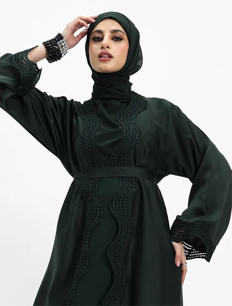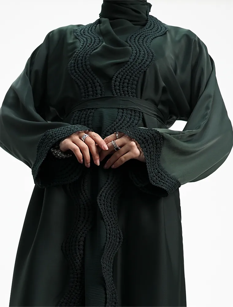 Crafted from luxurious, lustrous satin, this two-piece abaya set drapes beautifully to create an effortlessly elegant and modest silhouette. Designed for both comfort and sophistication, the flowing outer abaya features delicate Safiya-inspired lace detailing along the front and cuffs, adding a refined and timeless finish.