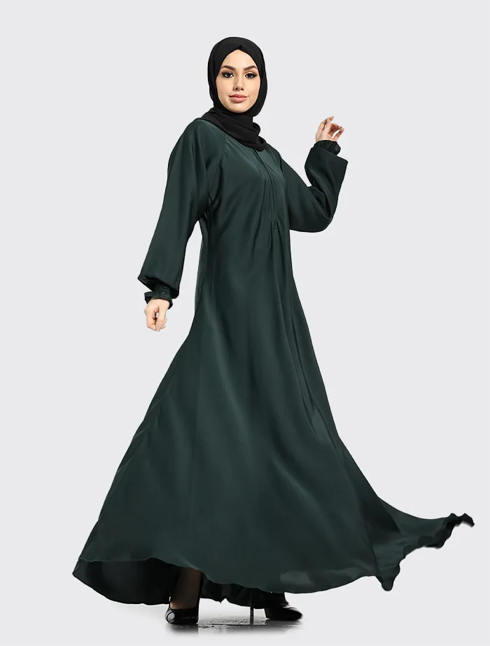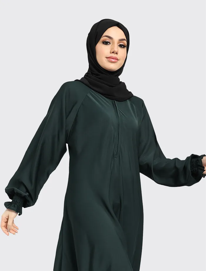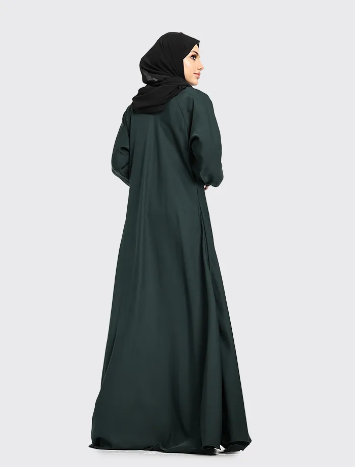 Crafted from premium Nida fabric, this abaya features a full-flare umbrella cut that offers both elegance and comfort. The round neckline is complemented by a concealed front zip for ease of wear, while the sleeves are finished with elasticated cuffs for a modest yet practical touch. Perfect for maternity and everyday wear, this abaya combines effortless style with everyday functionality.