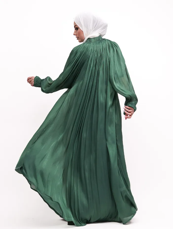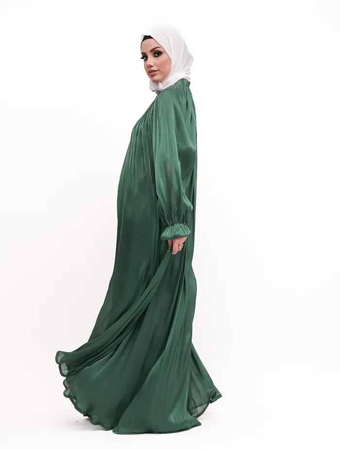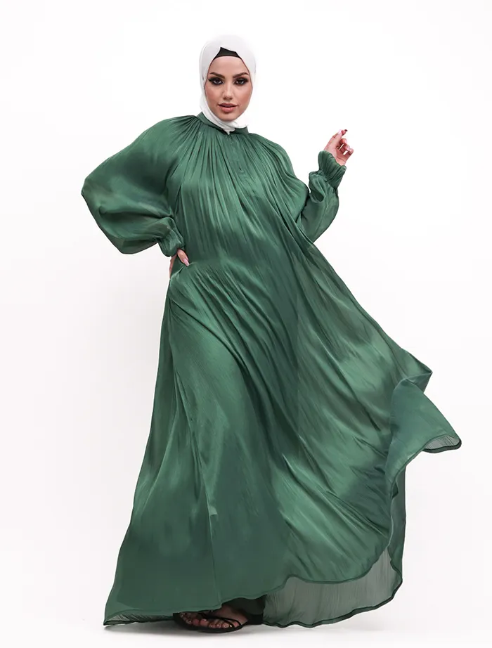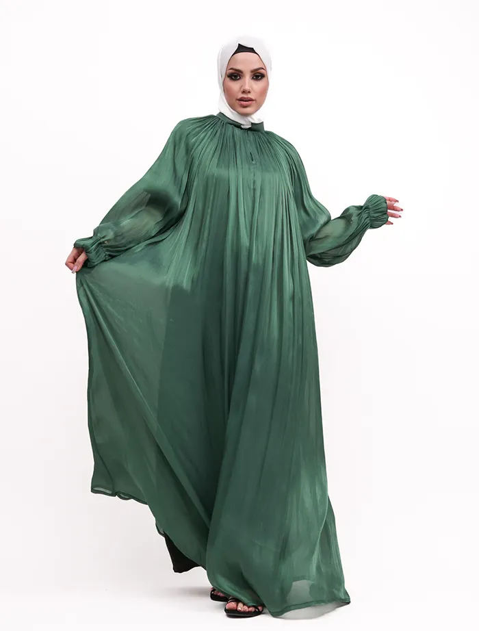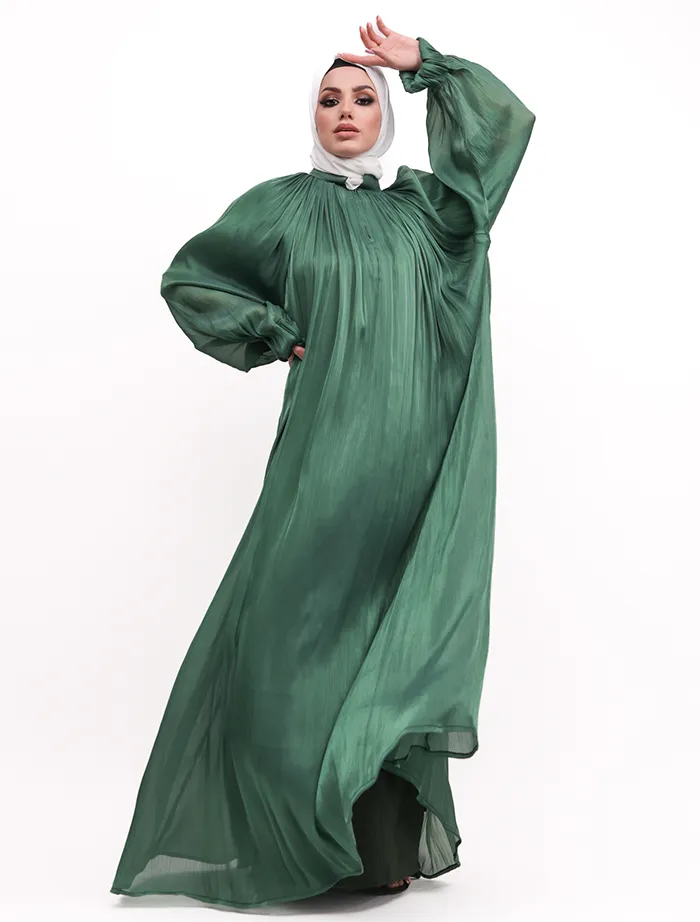 An organza umbrella cut abaya with a separate lining garment typically features an elegant and flowing silhouette due to the umbrella cut. Features a collar, adding a structured element to the abaya. Has a zip opening at the top, making it easy to wear and remove. Balloon sleeves with elasticated cuffs, giving a puffy and stylish look.