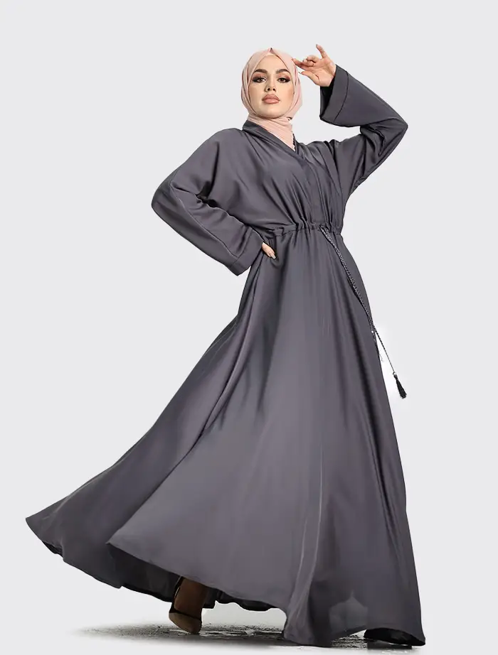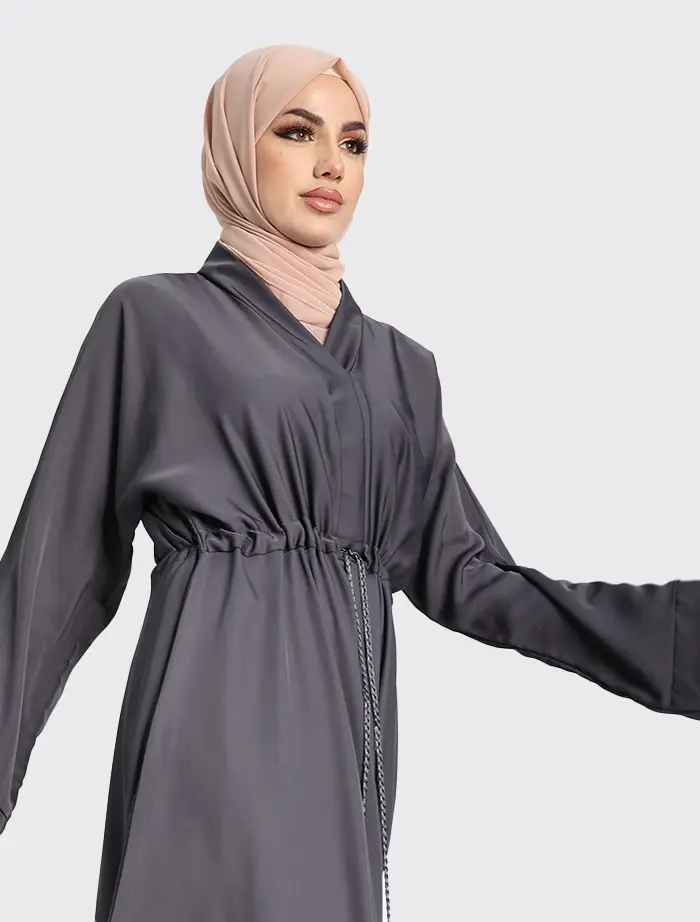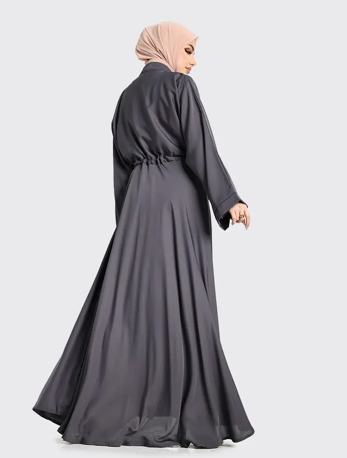 The style features a V-neckline and a draw cord on the waistline to achieve a more structured fit⋅ The Nida fabric compliments the full flare cut umbrella bottom⋅