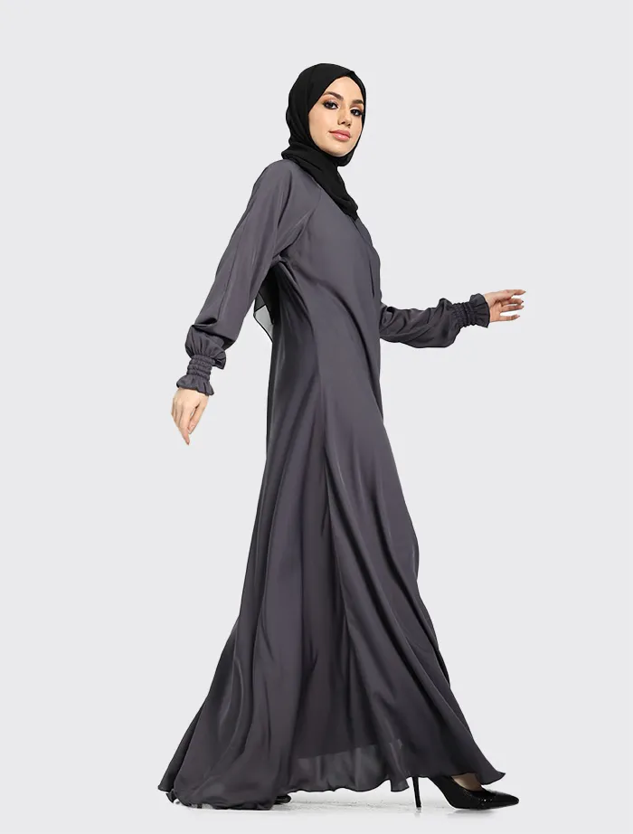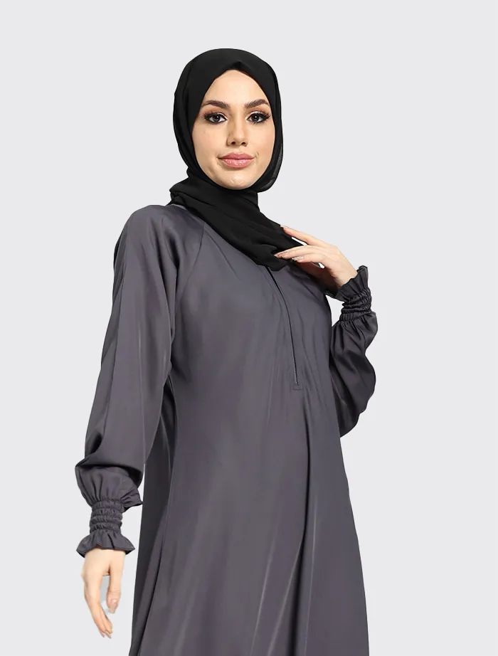 Crafted from premium Nida fabric, this abaya features a full-flare umbrella cut that offers both elegance and comfort. The round neckline is complemented by a concealed front zip for ease of wear, while the sleeves are finished with elasticated cuffs for a modest yet practical touch. Perfect for maternity and everyday wear, this abaya combines effortless style with everyday functionality.