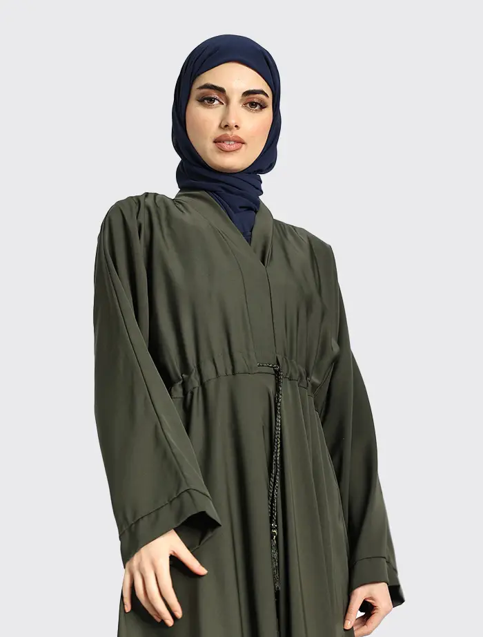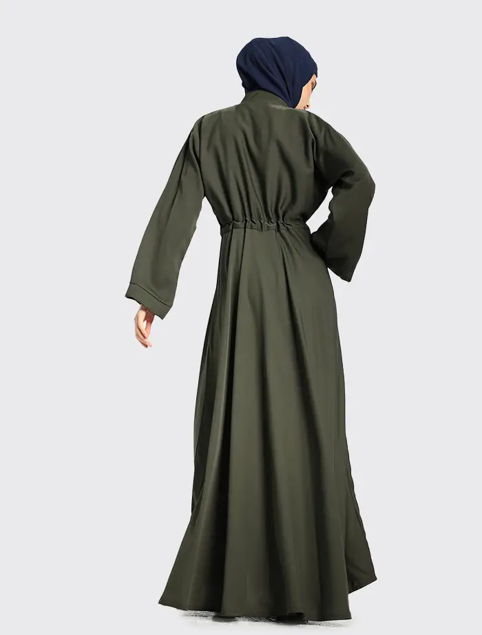 The style features a V-neckline and a draw cord on the waistline to achieve a more structured fit. The Nida fabric compliments the full flare cut umbrella bottom.