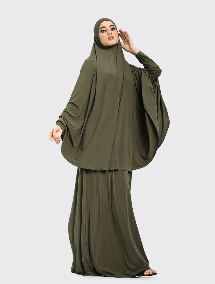 This Jersey Burkah and Skirt set is ideal for prayers or day wear. It is a Pull-on Hijab which drapes from the head and is made from a high-quality jersey fabric.