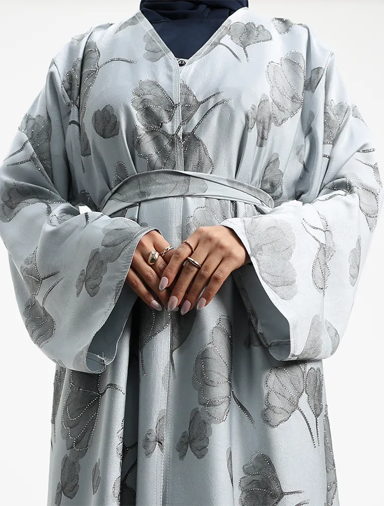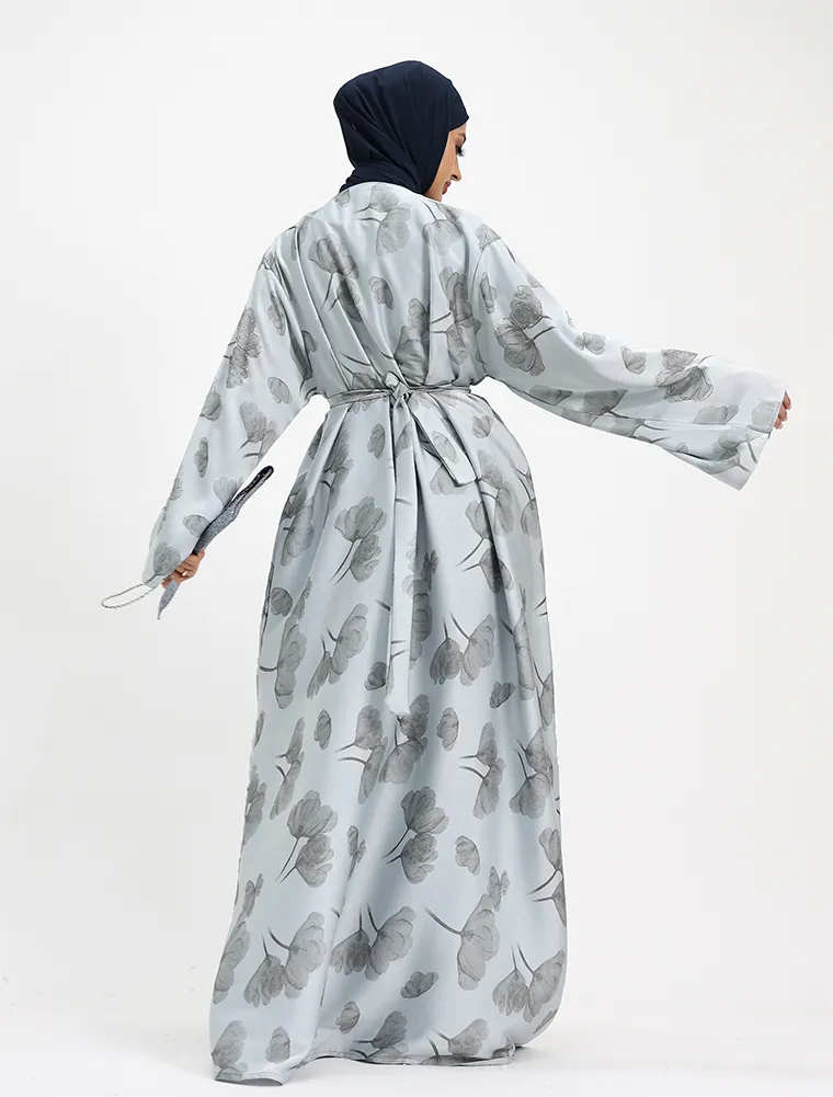 Elevate your modest wardrobe with this luxury satin open abaya, beautifully designed with Inara-inspired floral prints and delicate diamante detailing along the flower outlines for a subtle shimmer. Crafted from smooth, high-quality satin, this abaya offers a graceful drape and an elegant finish.