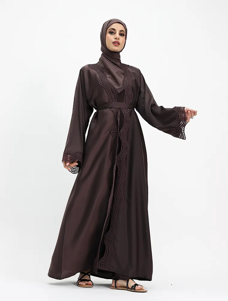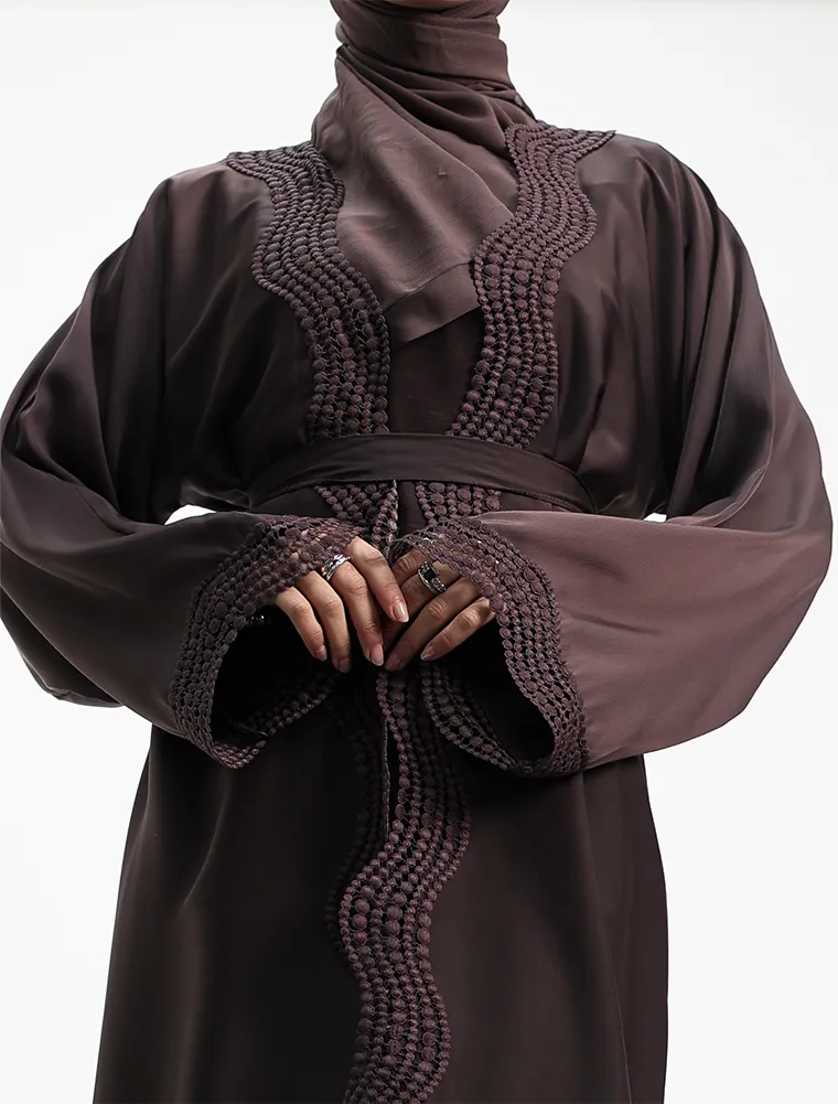 Crafted from luxurious, lustrous satin, this two-piece abaya set drapes beautifully to create an effortlessly elegant and modest silhouette. Designed for both comfort and sophistication, the flowing outer abaya features delicate Safiya-inspired lace detailing along the front and cuffs, adding a refined and timeless finish.