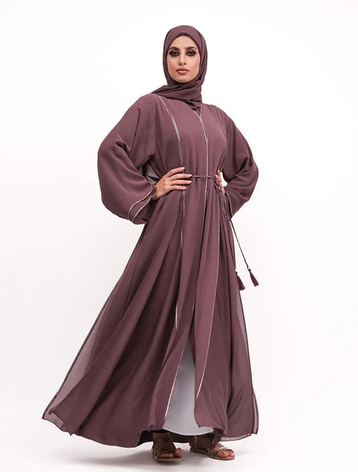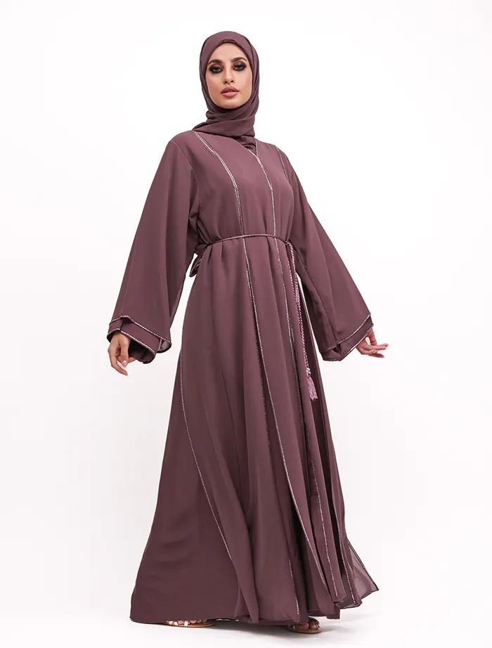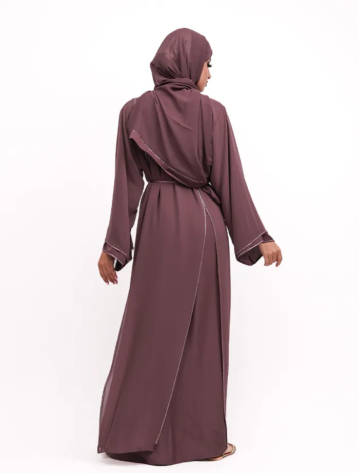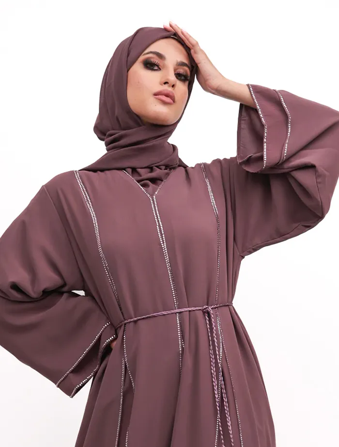 This chiffon A-line abaya features a round neckline and a Nida fabric inner layer with a front press button opening. Sparkling diamantes add a touch of elegance, making it perfect for dressy occasions. A rope belt cinches the waist for a more structured look. The outfit is complete with a matching hijab.