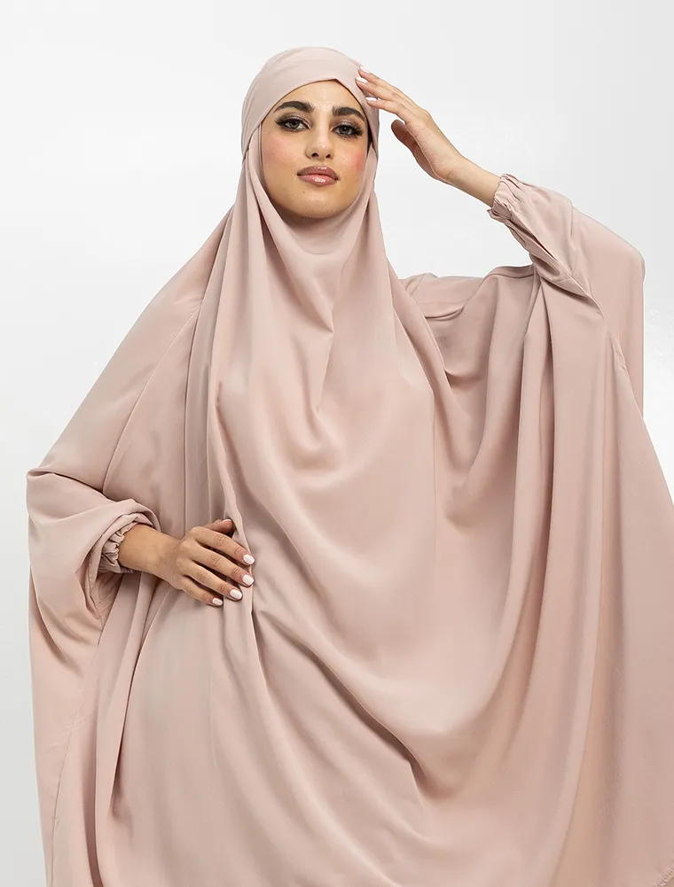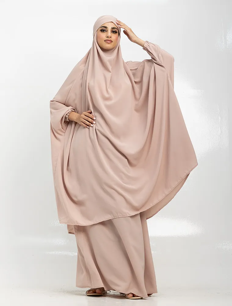 This half-jilbab set is thoughtfully designed with a chin-covering style and a tie-back headband for a secure and comfortable fit. The elasticated cuffs make performing wudhu easy and convenient, while the slightly flared skirt features an elasticated waistband to ensure a flexible fit for sizes 8 to 16. Sold as a free-size set, this khimar offers both modesty and ease for everyday wear.