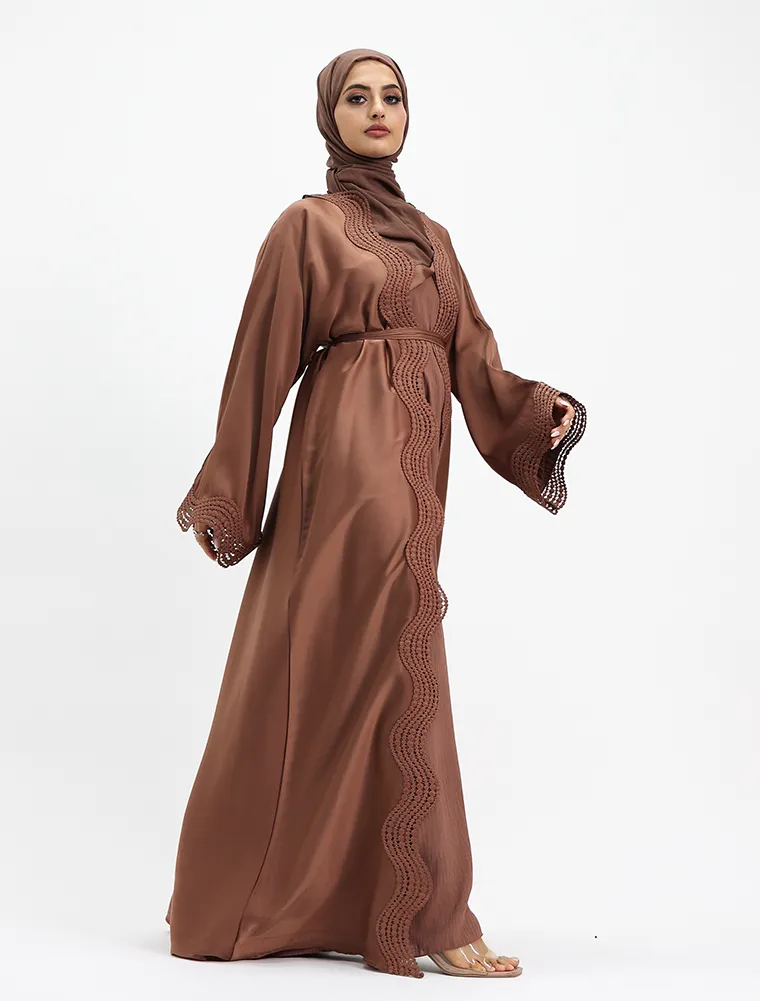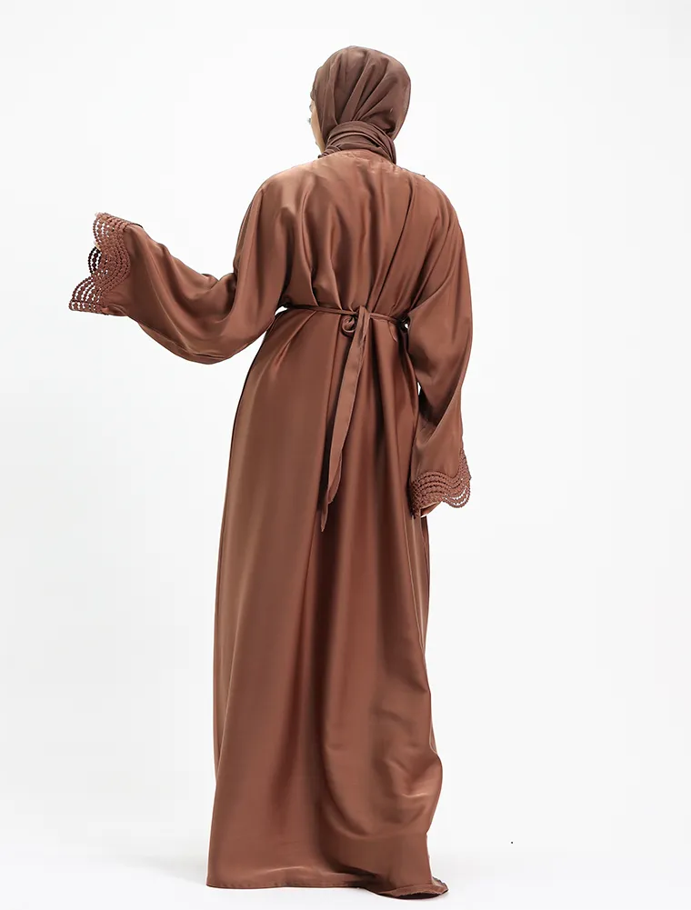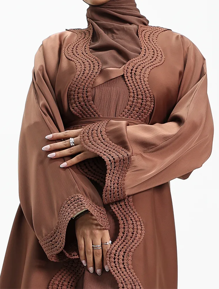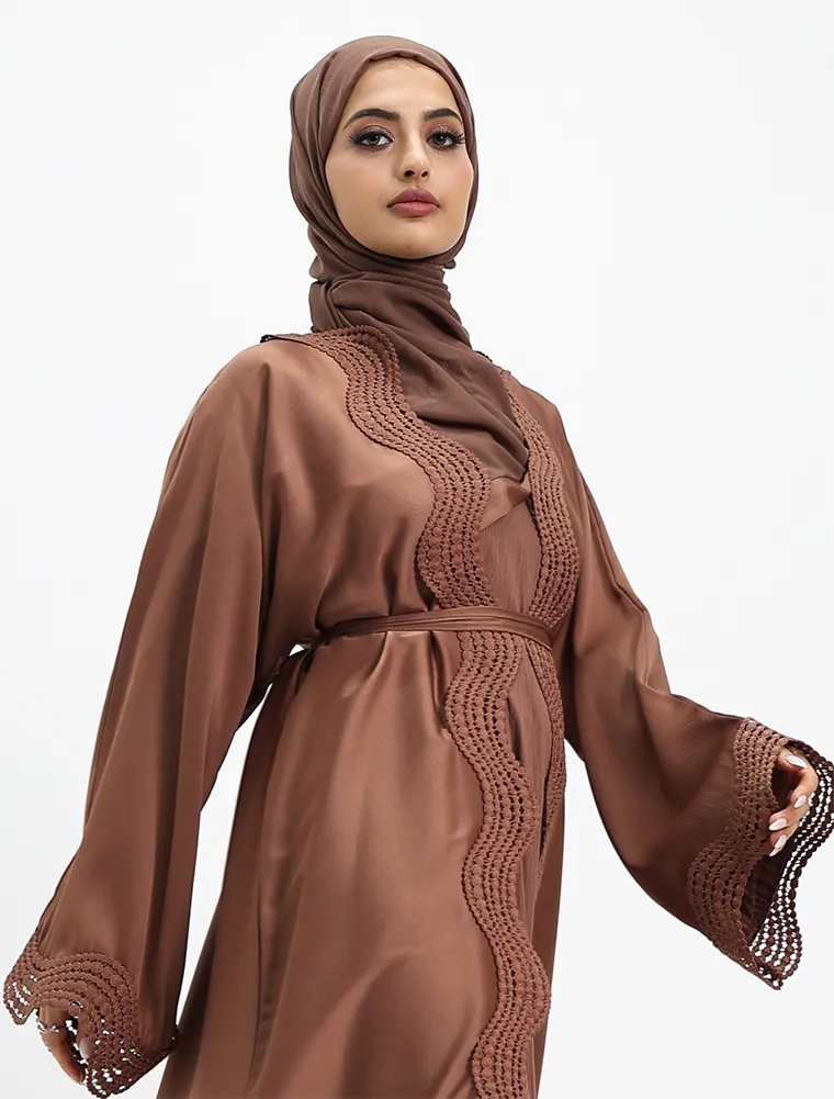 Crafted from luxurious, lustrous satin, this two-piece abaya set drapes beautifully to create an effortlessly elegant and modest silhouette. Designed for both comfort and sophistication, the flowing outer abaya features delicate Safiya-inspired lace detailing along the front and cuffs, adding a refined and timeless finish.