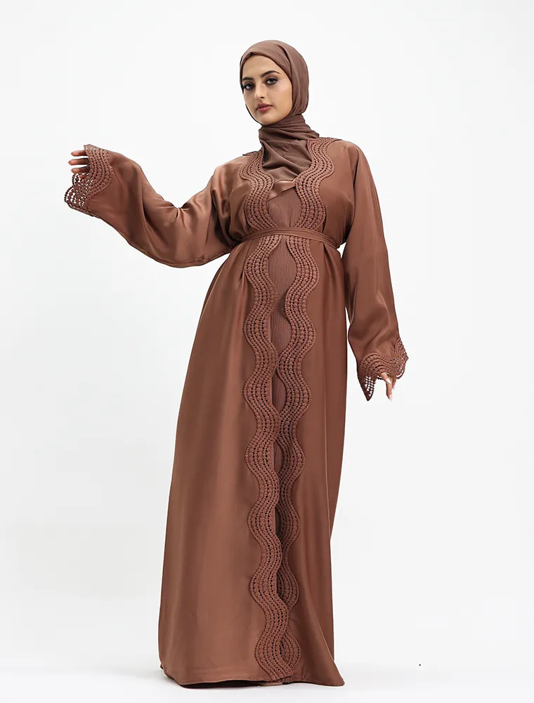The set includes a separate satin inner made from the same smooth fabric for a seamless layered look, a perfectly matching hijab, and a coordinating belt to provide a secure and flattering fit. Ideal for special occasions, evening wear, or elevated everyday styling, this satin abaya set combines graceful movement, modest design, and premium craftsmanship for a polished, luxurious look.