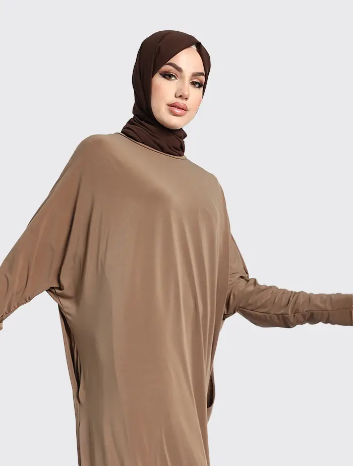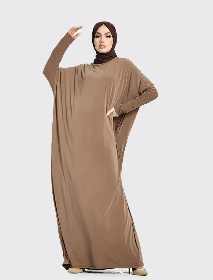 Mocha Batwing Jersey Abaya features loose cut fitting with stretchy cuffs at the