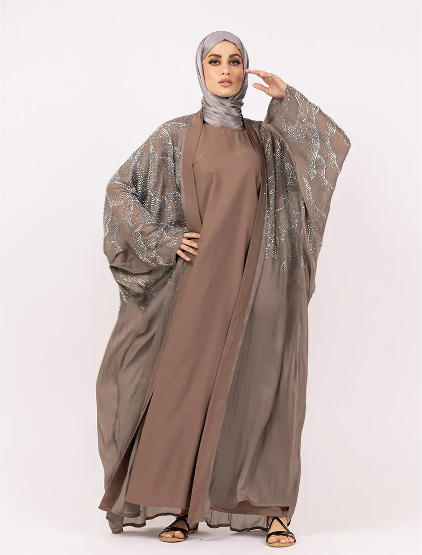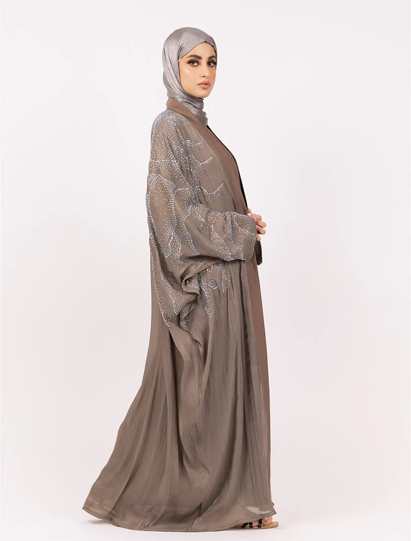 Make a lasting impression with this show-stopping Crystal-Embellished Abaya, crafted for evenings that call for elegance and glamor. Featuring a unique sheer overlay adorned with glimmering crystal embellishments, this abaya is a perfect fusion of modesty and statement style.