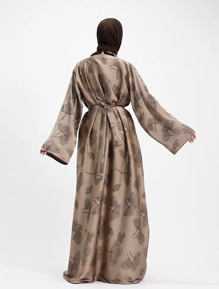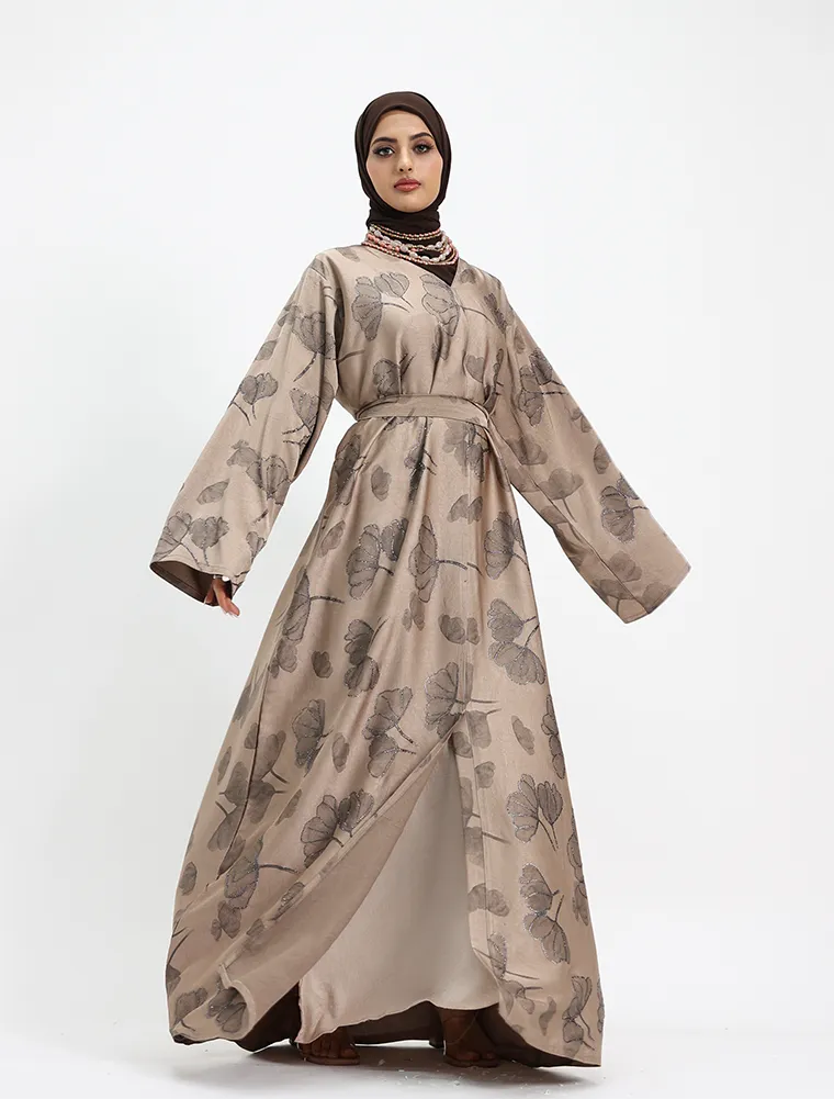 Elevate your modest wardrobe with this luxury satin open abaya, beautifully designed with Inara-inspired floral prints and delicate diamante detailing along the flower outlines for a subtle shimmer. Crafted from smooth, high-quality satin, this abaya offers a graceful drape and an elegant finish.