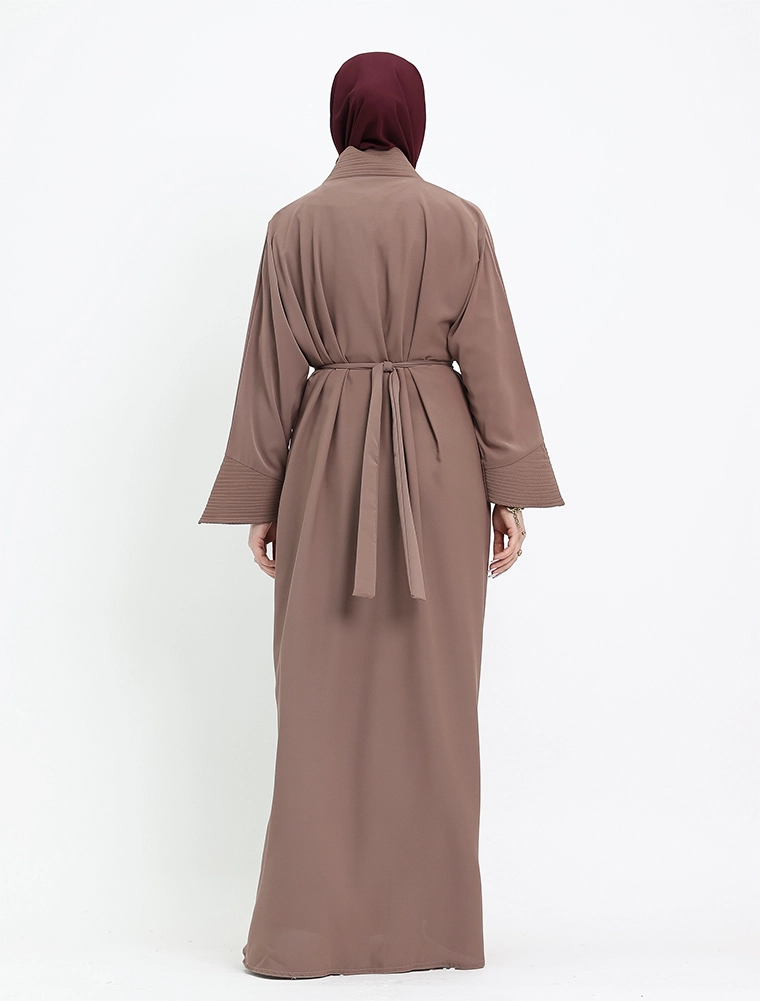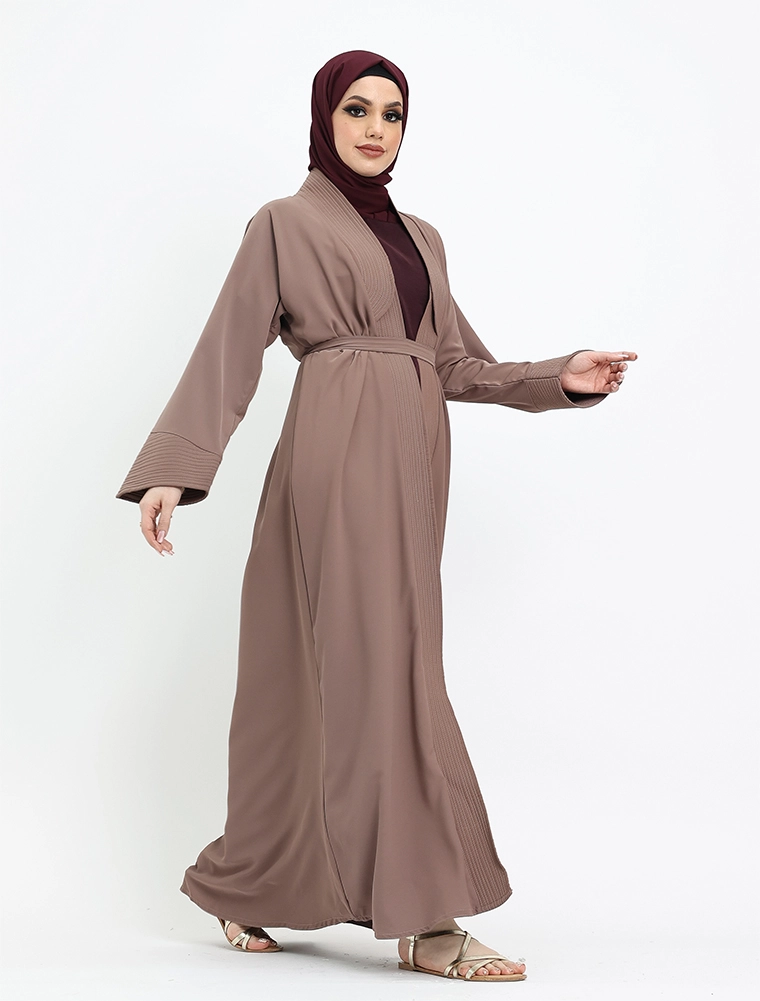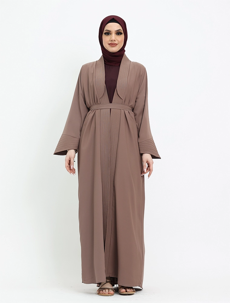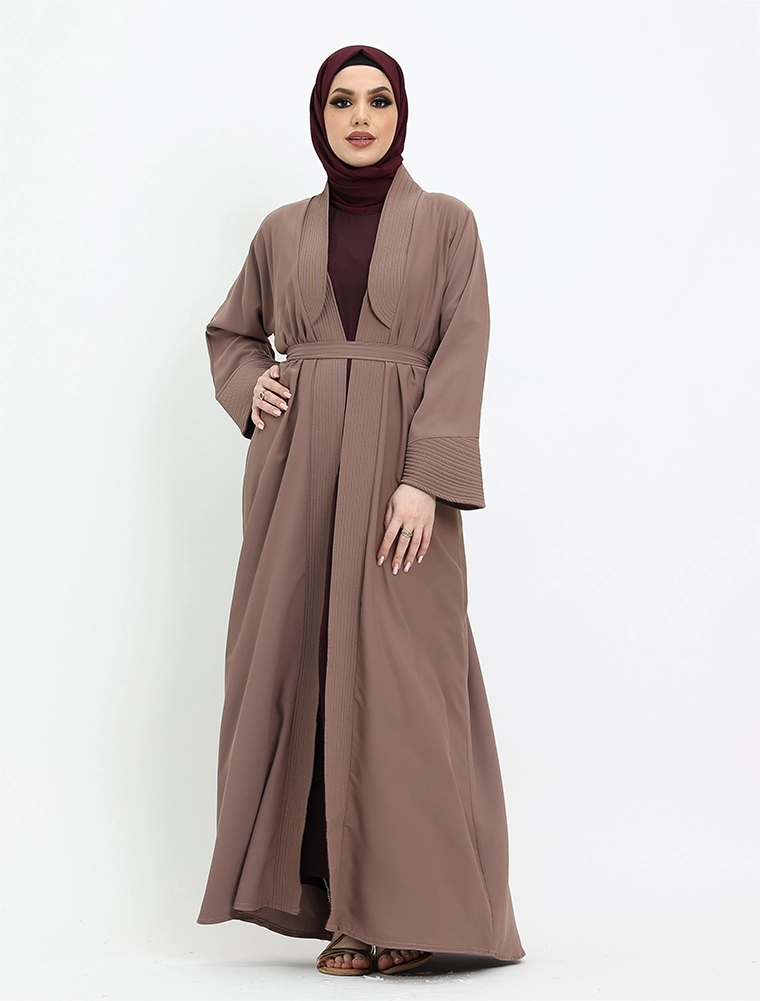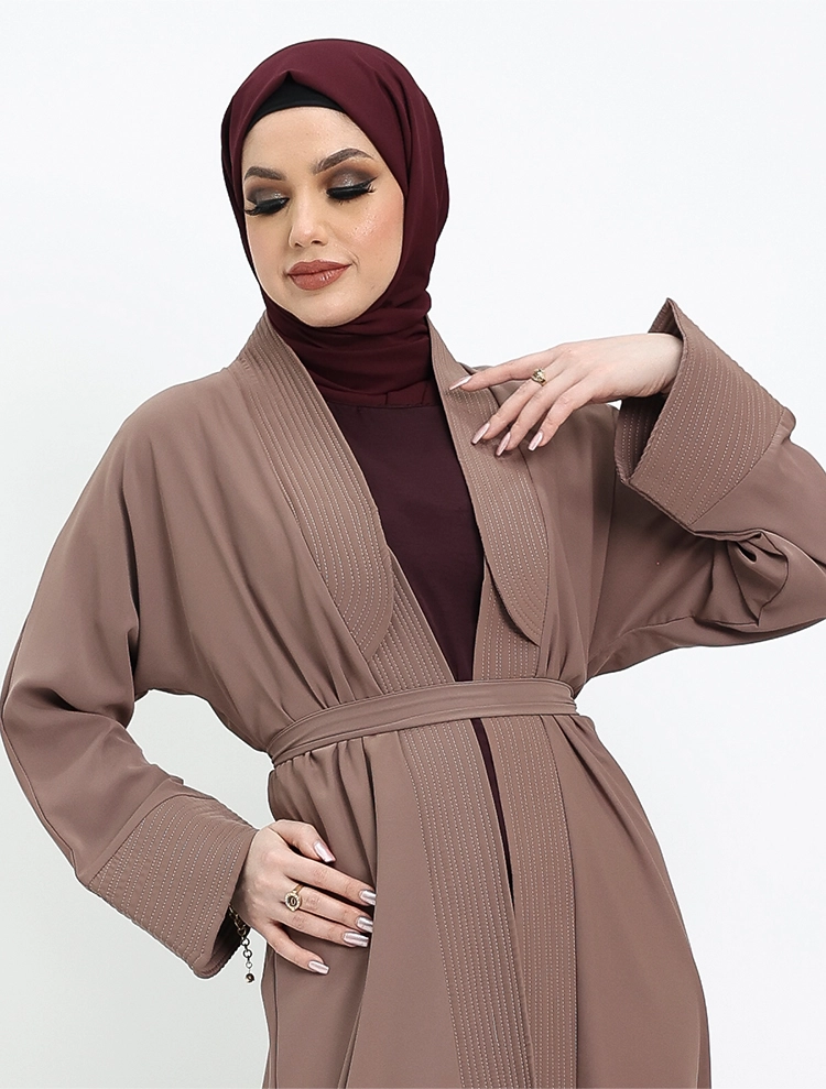 Embrace the elegance of this minimalist open abaya crafted from soft peach-toned fabric. Featuring a padded front placket and cuffs with intricate stitching, it's ideal for both formal occasions and casual outings or holidays. Add the belt for a more defined, structured silhouette.