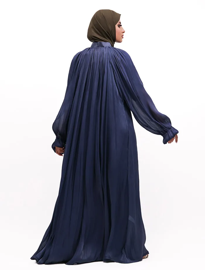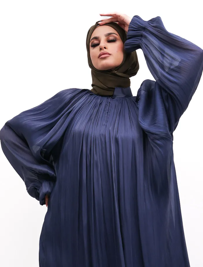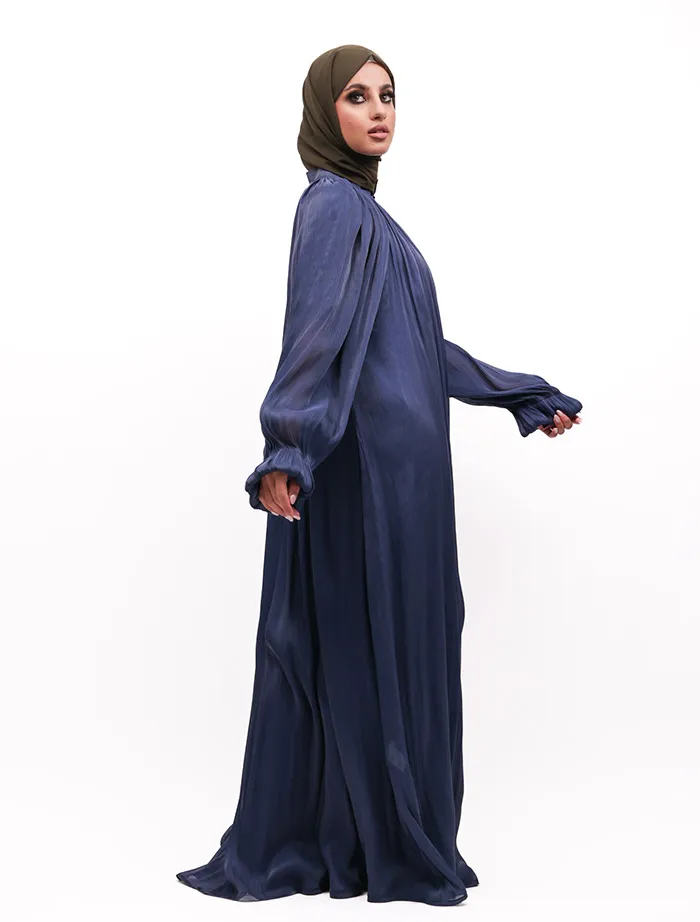An organza umbrella cut abaya with a separate lining garment typically features an elegant and flowing silhouette due to the umbrella cut. Features a collar, adding a structured element to the abaya. Has a zip opening at the top, making it easy to wear and remove. Balloon sleeves with elasticated cuffs, giving a puffy and stylish look.