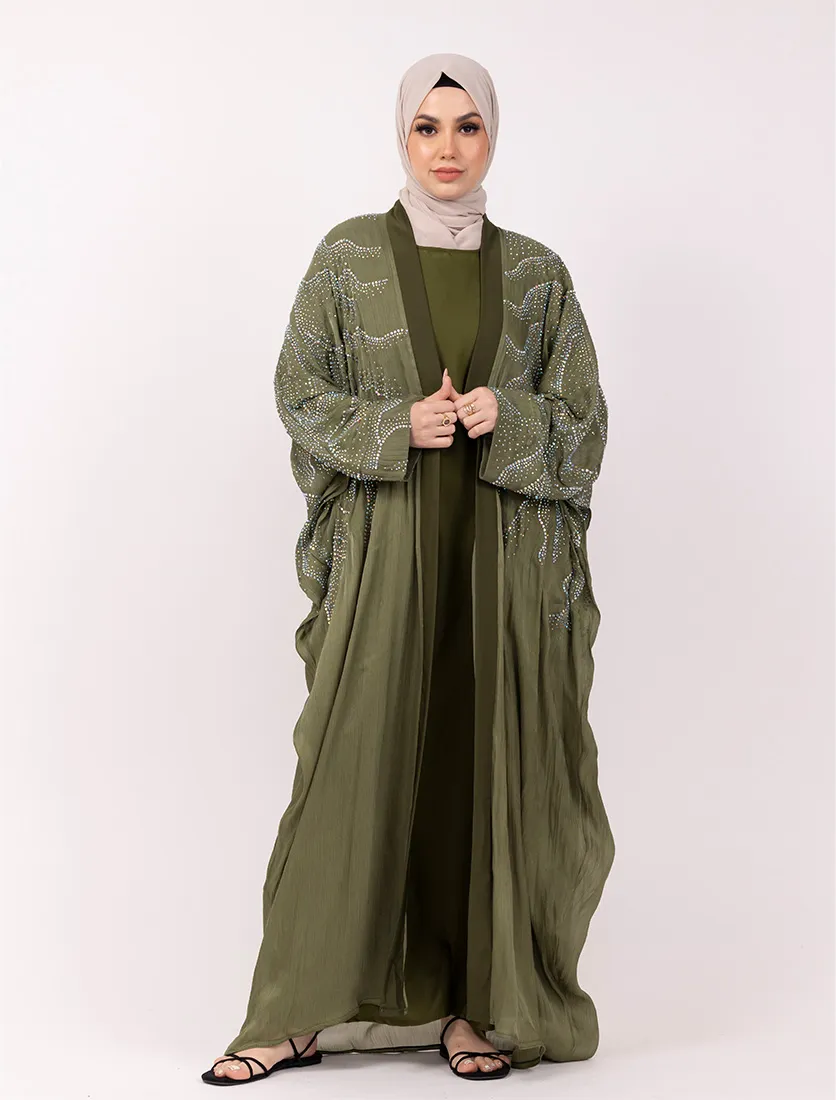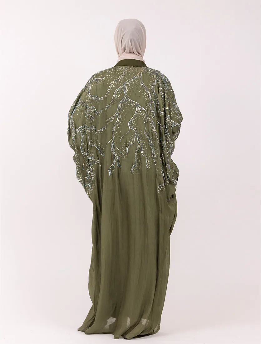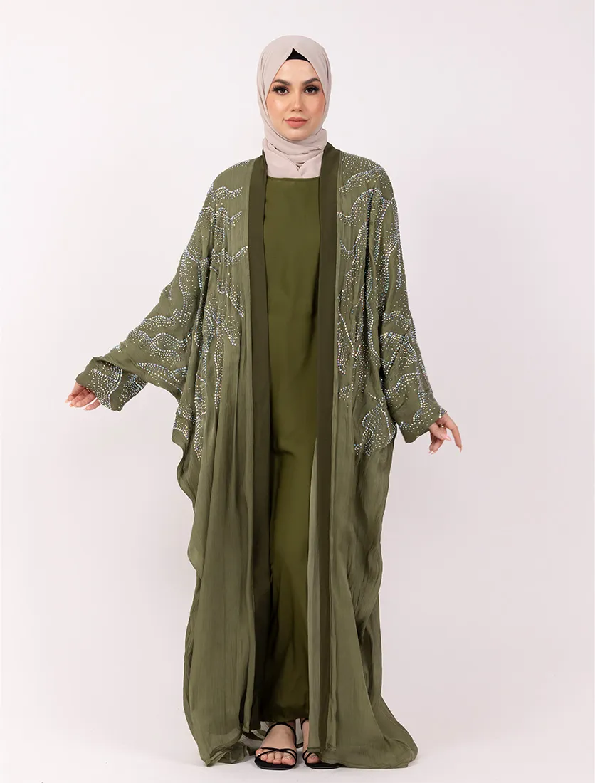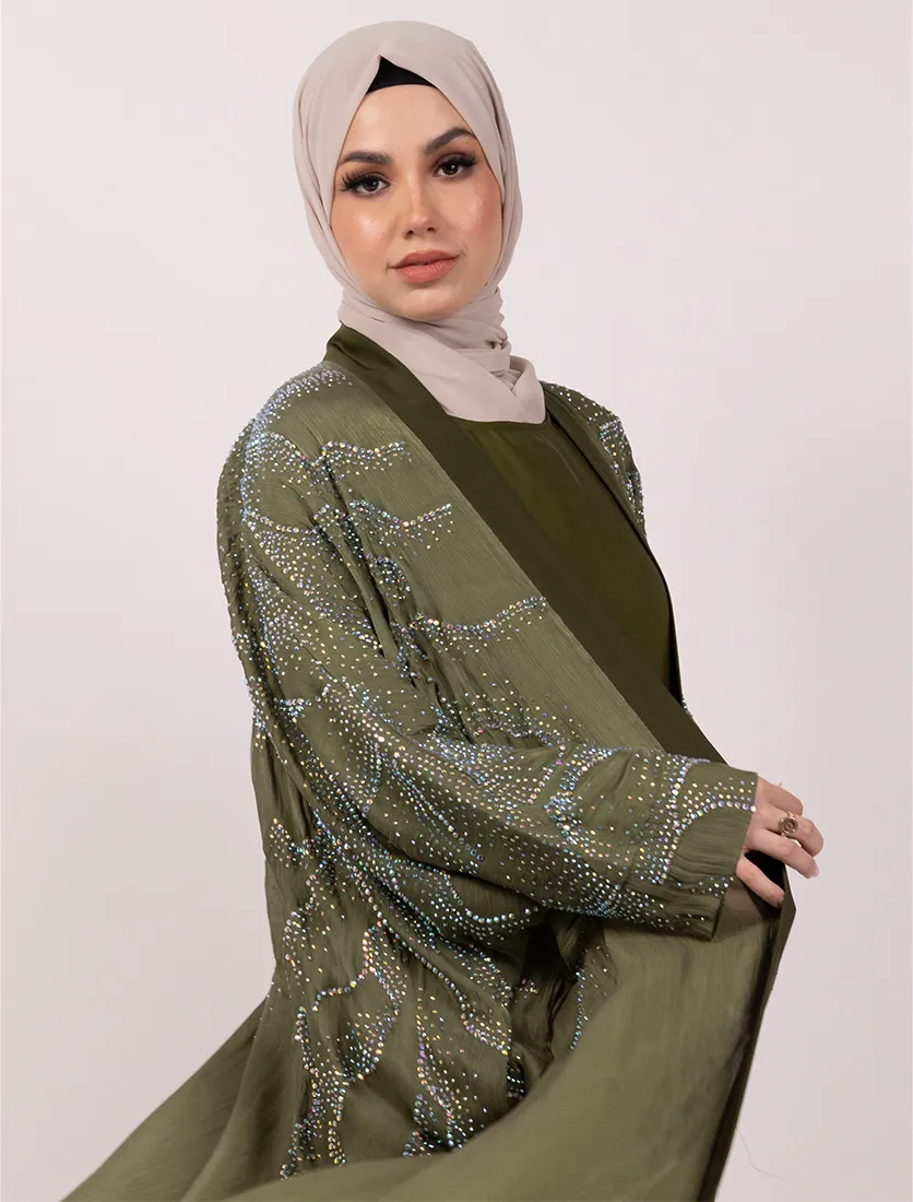 Make a lasting impression with this show-stopping Crystal-Embellished Abaya, crafted for evenings that call for elegance and glamor. Featuring a unique sheer overlay adorned with glimmering crystal embellishments, this abaya is a perfect fusion of modesty and statement style.