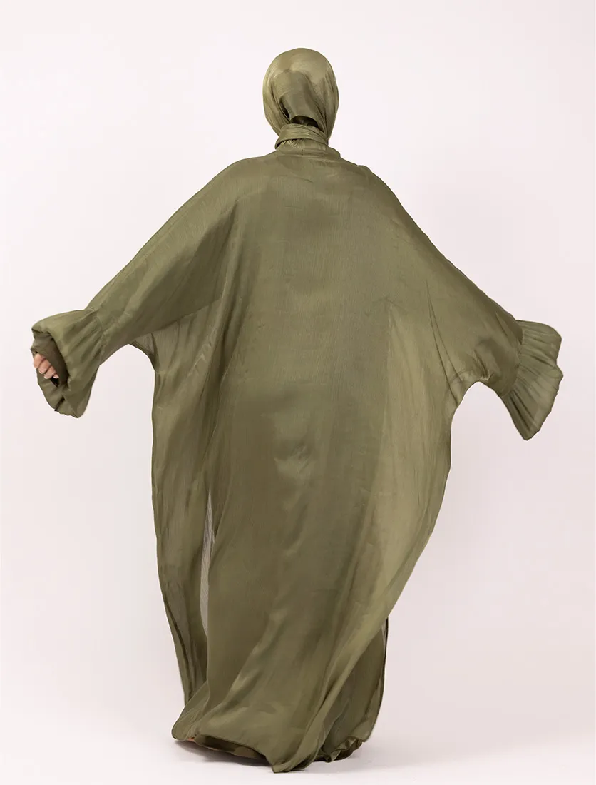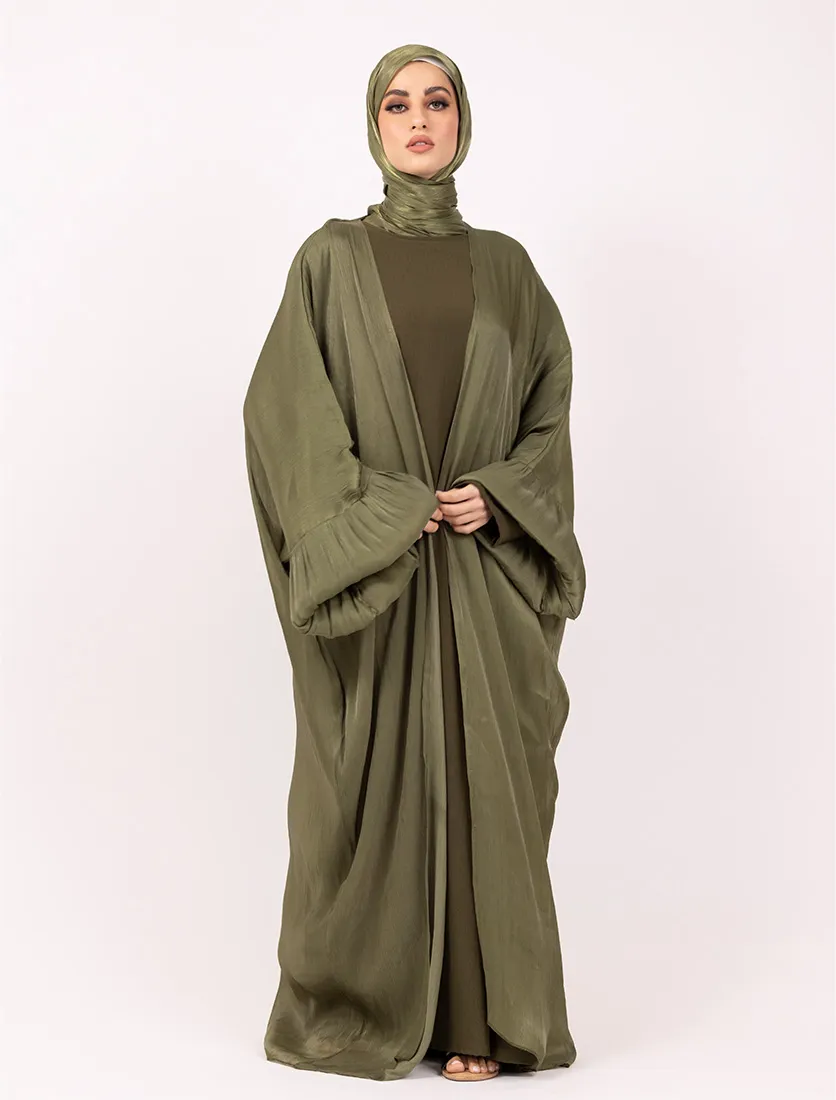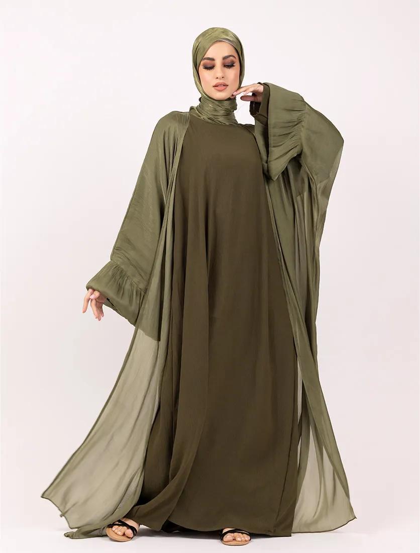 Make a graceful statement with this flowing kaftan set, featuring a billowing silhouette crafted from soft, lightweight fabric with a crinkle pleat texture. The set includes a matching inner slip and hijab, offering complete coordination for a polished look. Designed with dramatic wide sleeves and inner belt fastening for adjustable shaping, it balances elegance with comfort—ideal for special occasions or elevated everyday wear.