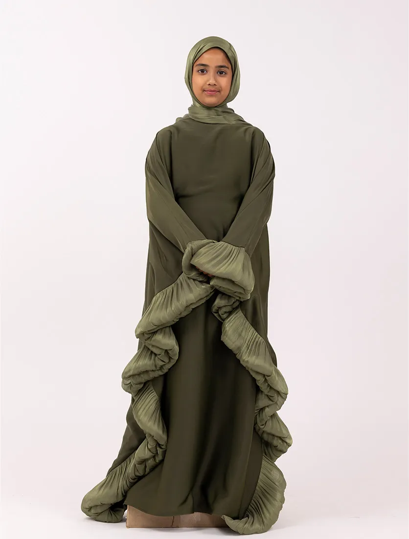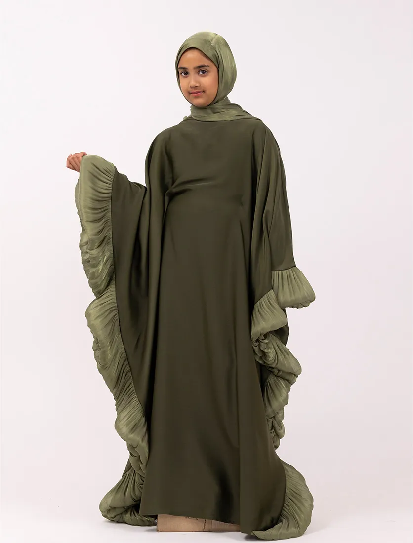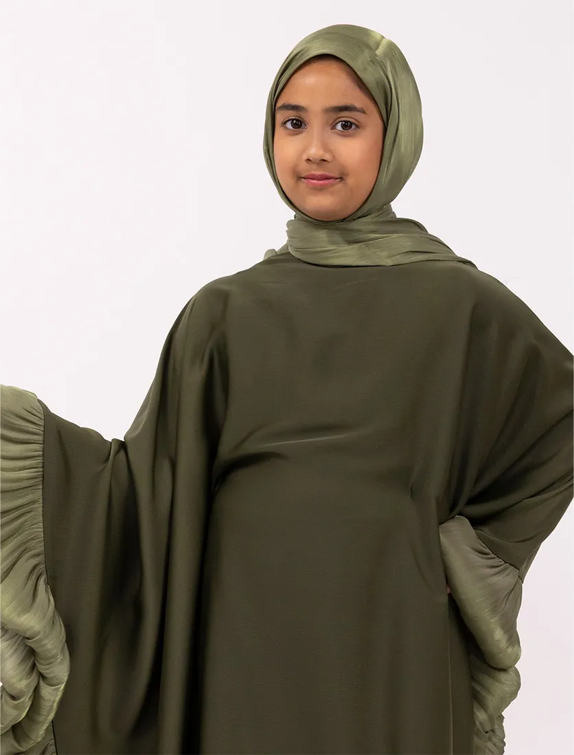 Blending elegance with modern modesty, this kaftan-style abaya features fluid lines and statement pleated accents for a look that’s both striking and effortless. A hidden inner belt at the waist allows you to customize the fit to your liking—cinched for shape or loose for a relaxed silhouette.