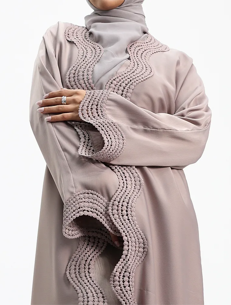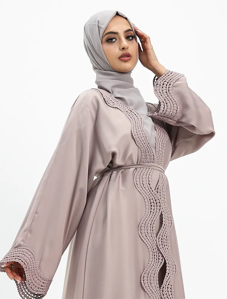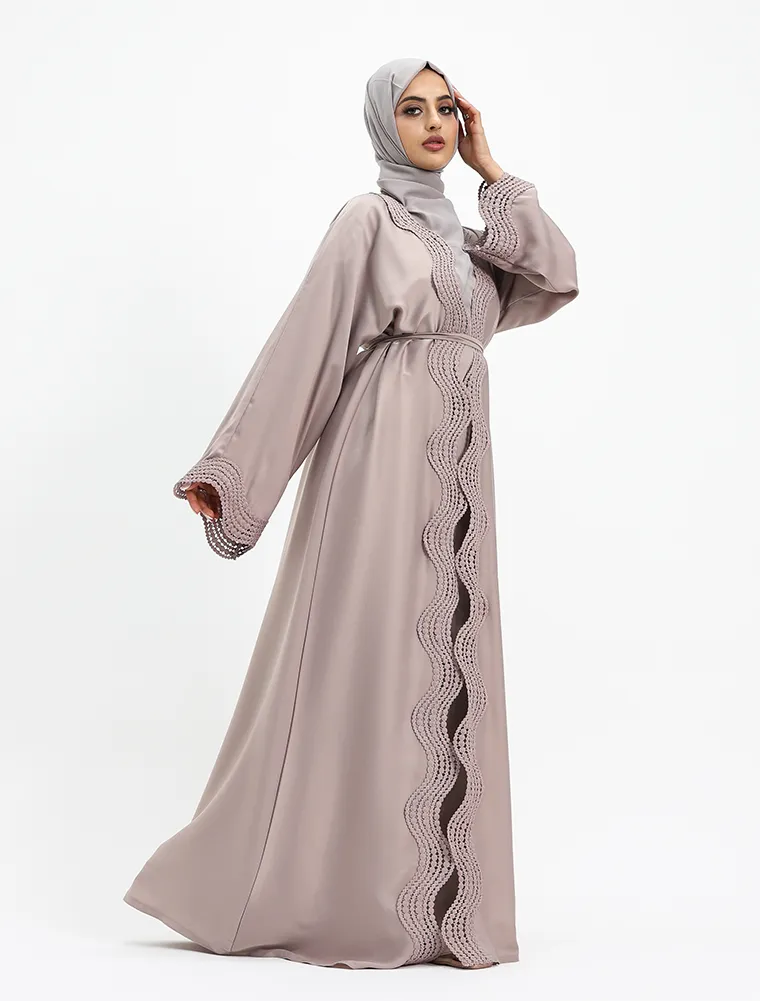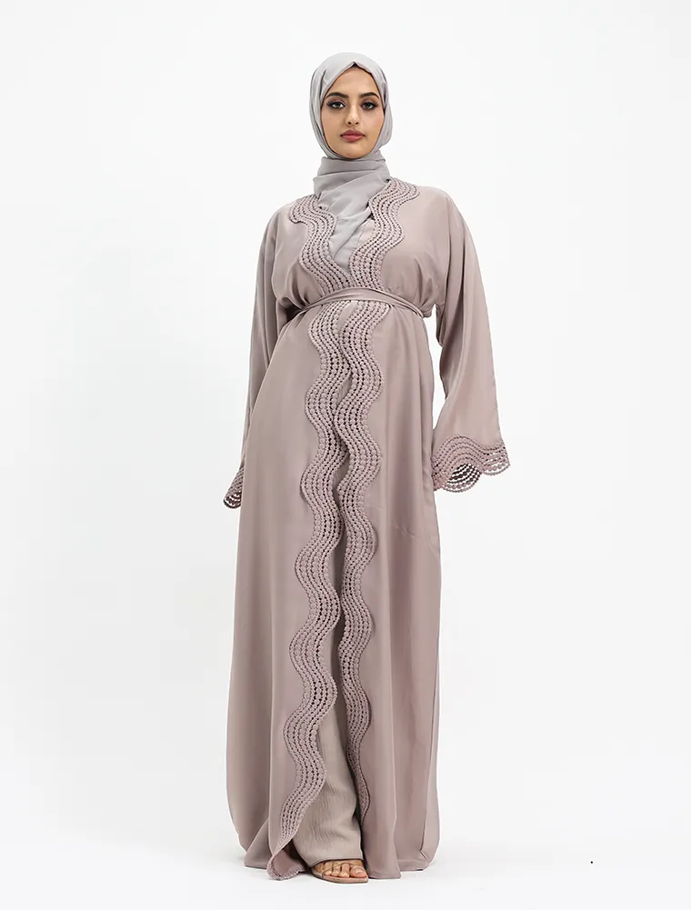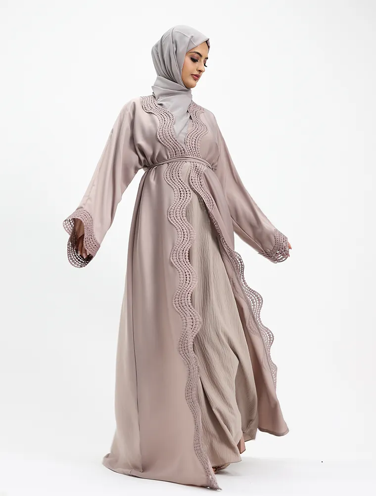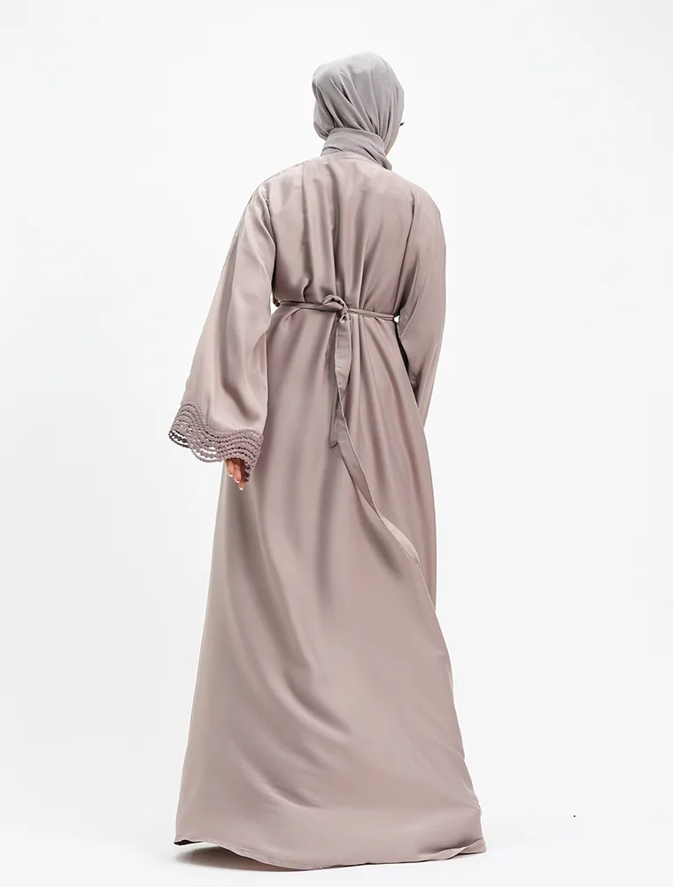 Crafted from luxurious, lustrous satin, this two-piece abaya set drapes beautifully to create an effortlessly elegant and modest silhouette. Designed for both comfort and sophistication, the flowing outer abaya features delicate Safiya-inspired lace detailing along the front and cuffs, adding a refined and timeless finish.