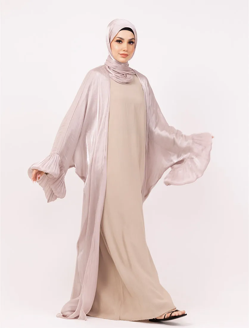 Make a graceful statement with this flowing kaftan set, featuring a billowing silhouette crafted from soft, lightweight fabric with a crinkle pleat texture. The set includes a matching inner slip and hijab, offering complete coordination for a polished look. Designed with dramatic wide sleeves and inner belt fastening for adjustable shaping, it balances elegance with comfort—ideal for special occasions or elevated everyday wear.