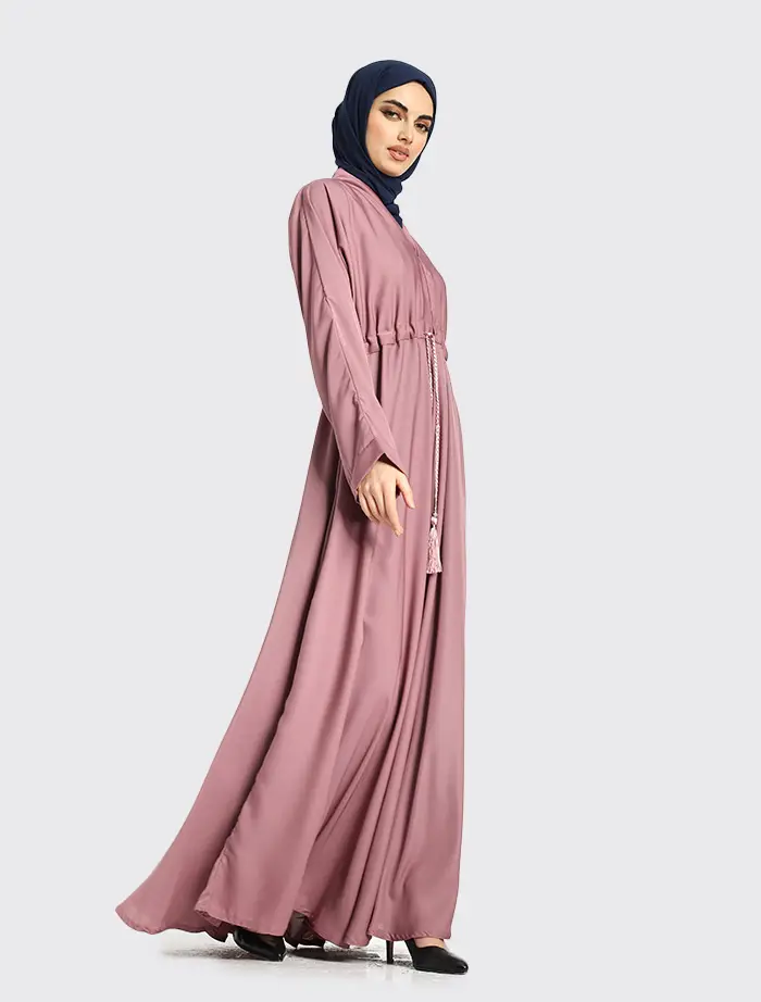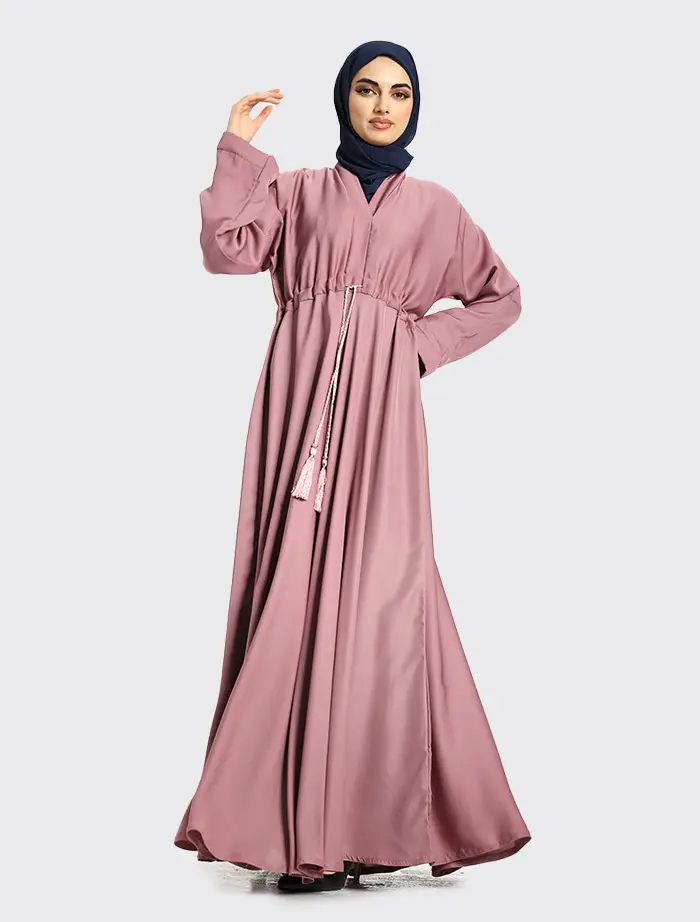 The style features a V-neckline and a draw cord on the waistline to achieve a more structured fit. The Nida fabric compliments the full flare cut umbrella bottom.