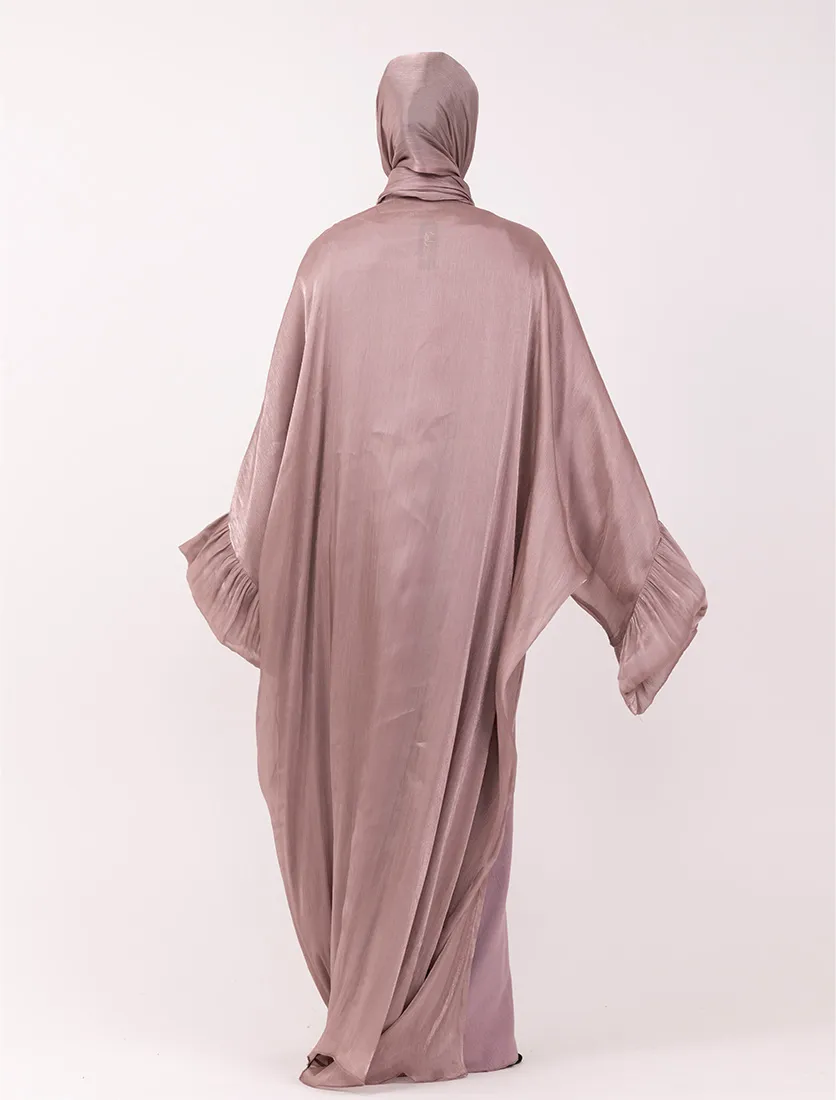 Make a graceful statement with this flowing kaftan set, featuring a billowing silhouette crafted from soft, lightweight fabric with a crinkle pleat texture. The set includes a matching inner slip and hijab, offering complete coordination for a polished look. Designed with dramatic wide sleeves and inner belt fastening for adjustable shaping, it balances elegance with comfort—ideal for special occasions or elevated everyday wear.
