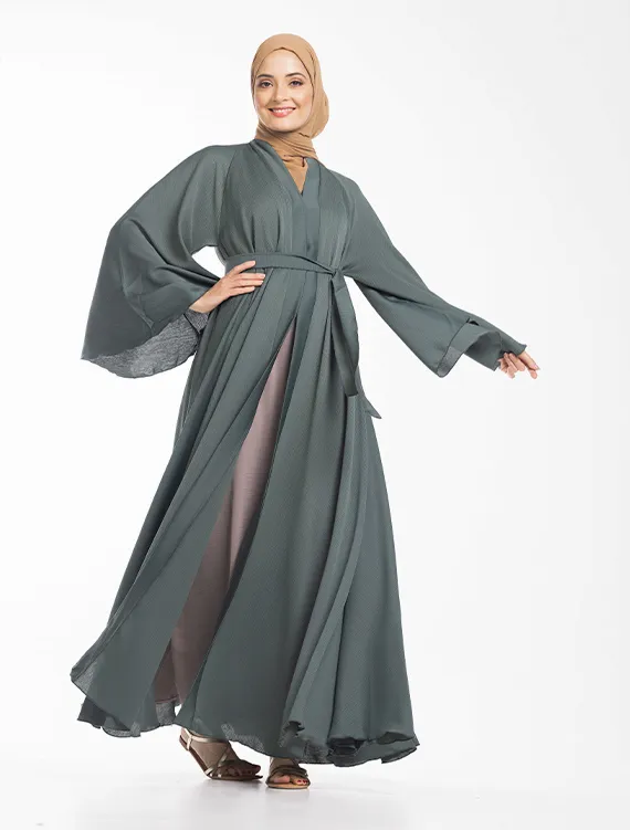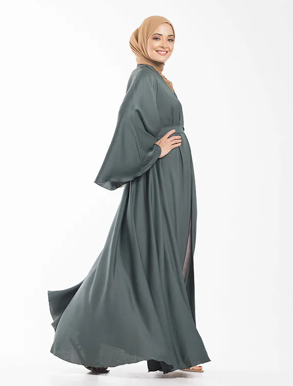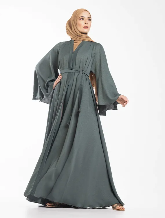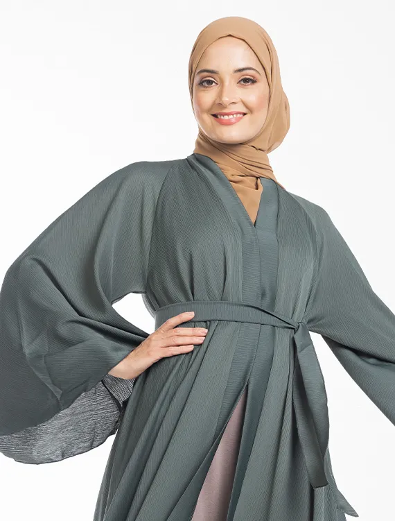 The Nida Crinkle fabric compliments the full flare cut umbrella styling. Other detailing includes flared sleeves, V-neckline and hidden press buttons running down the front.