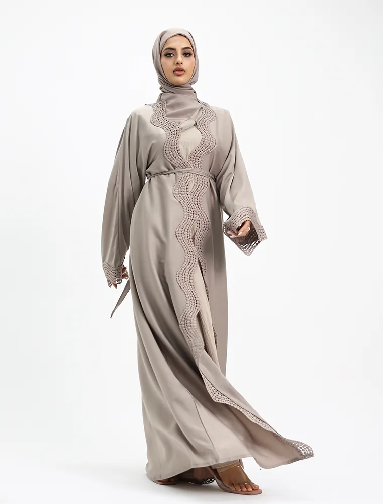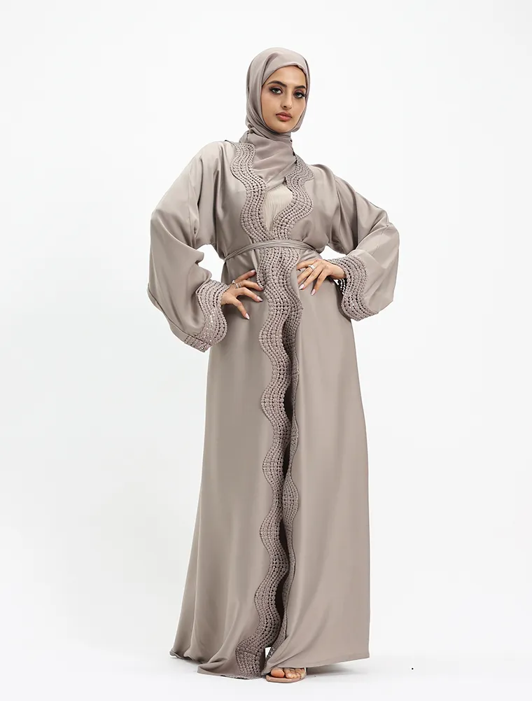 Crafted from luxurious, lustrous satin, this two-piece abaya set drapes beautifully to create an effortlessly elegant and modest silhouette. Designed for both comfort and sophistication, the flowing outer abaya features delicate Safiya-inspired lace detailing along the front and cuffs, adding a refined and timeless finish.